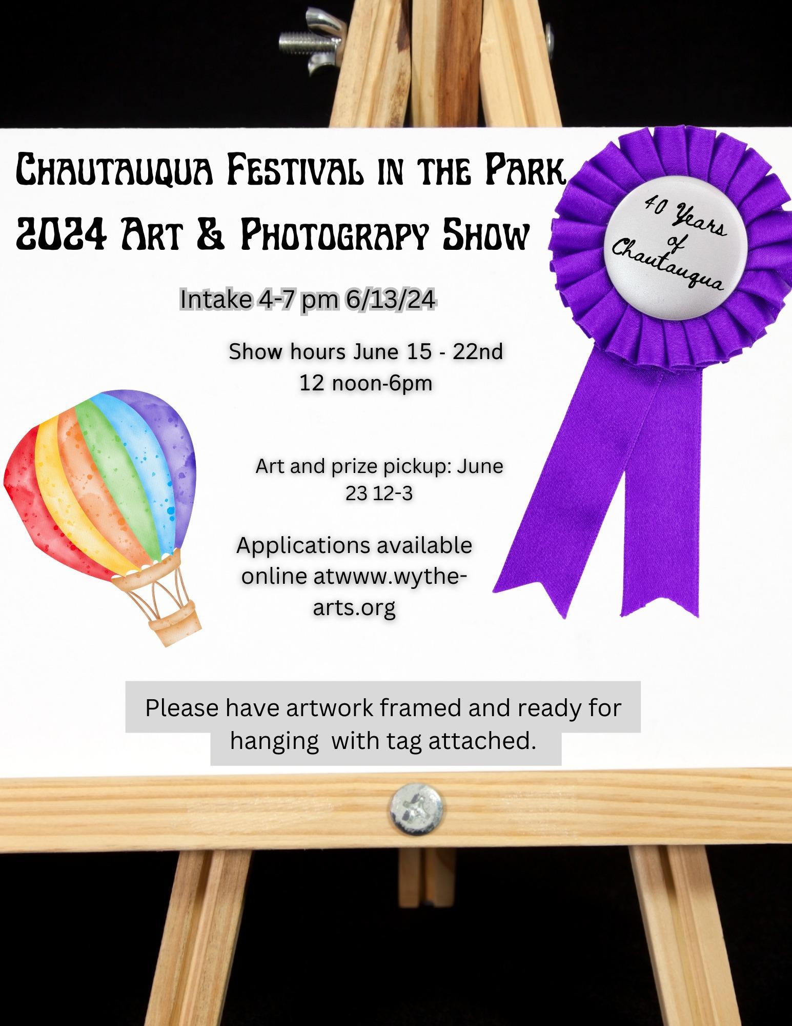 The annual Chautauqua Art & Photography Show will be accepting artwork (paintings, drawings, photos, sculptures and jewelry) entries for hanging and display on Thursday, June 13th from 4pm-7pm in the lower level of the 4th Street Community Center. Judging will take place on Friday, June 14th. Access by the general public will be June 15th through 22nd, 2024. Artwork must be picked up between the hours of 10am–2pm on Sunday, June 23rd. Please go to page 14 for a QR Code for our website for more information to participate.