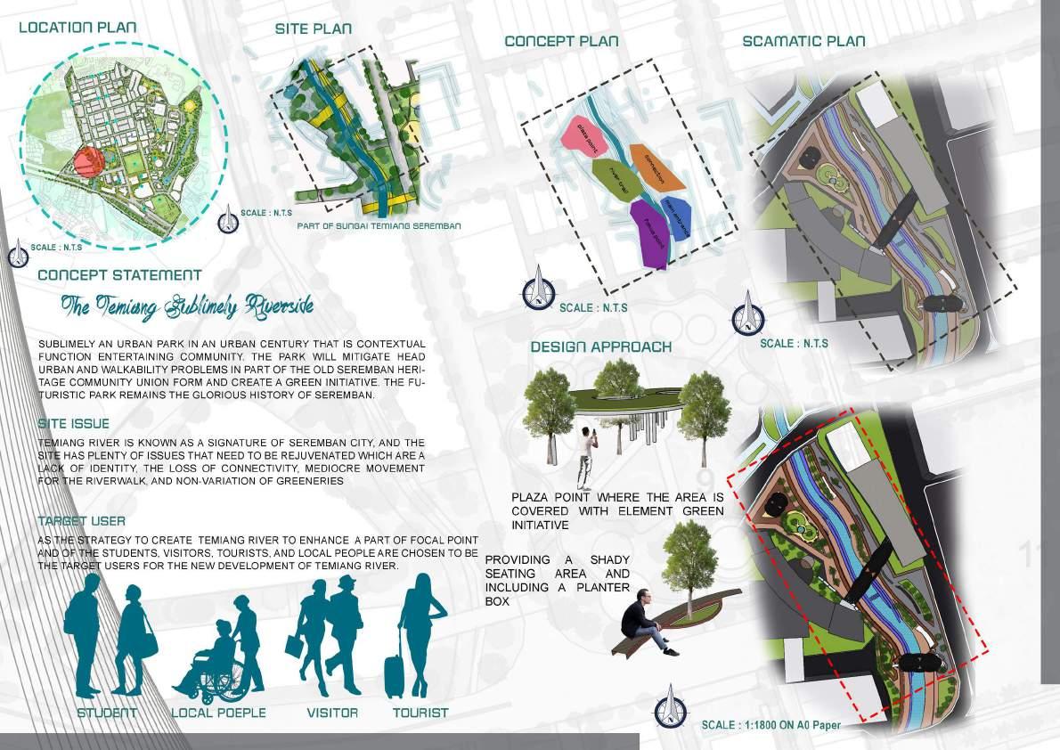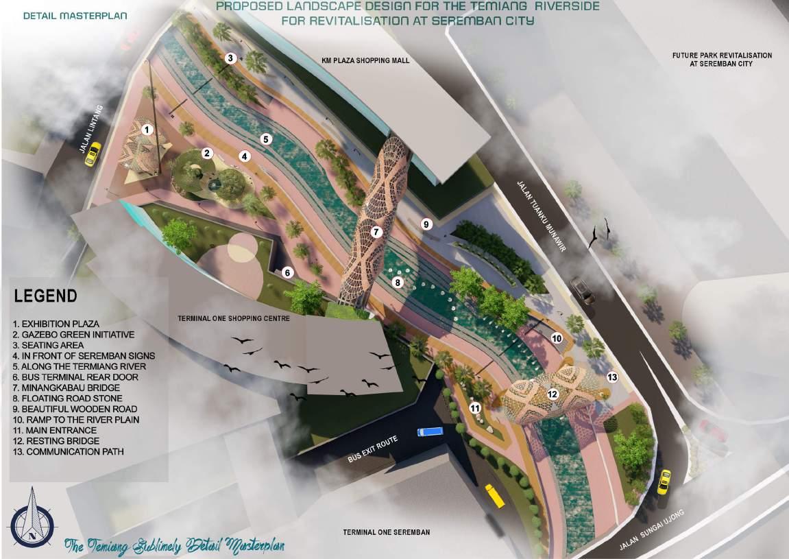 AN URBAN PARK WITH CONTEXTUAL FUNCTION AND COMMUNITY ENTERTAINMENT THE PARK WILL ADDRESS HEAD URBAN AND WALKABILITY PROBLEMS IN SOME OLD SEREMBAN HERITAGE COMMUNITY UNION FORMS AND CREATE A GREEN INITIATIVE THE FUTURISTIC PARK REPRESENTS THE GLORY OF SEREMBAN S PAST. TEMIANG RIVER IS KNOWN AS A SIGNATURE OF SEREMBAN CITY, AND THE SITE HAS PLENTY OF ISSUES THAT NEED TO BE REJUVENATED: