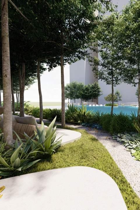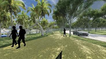 Perspective view from the pedestrian promenade in the shelter of coconut palms
