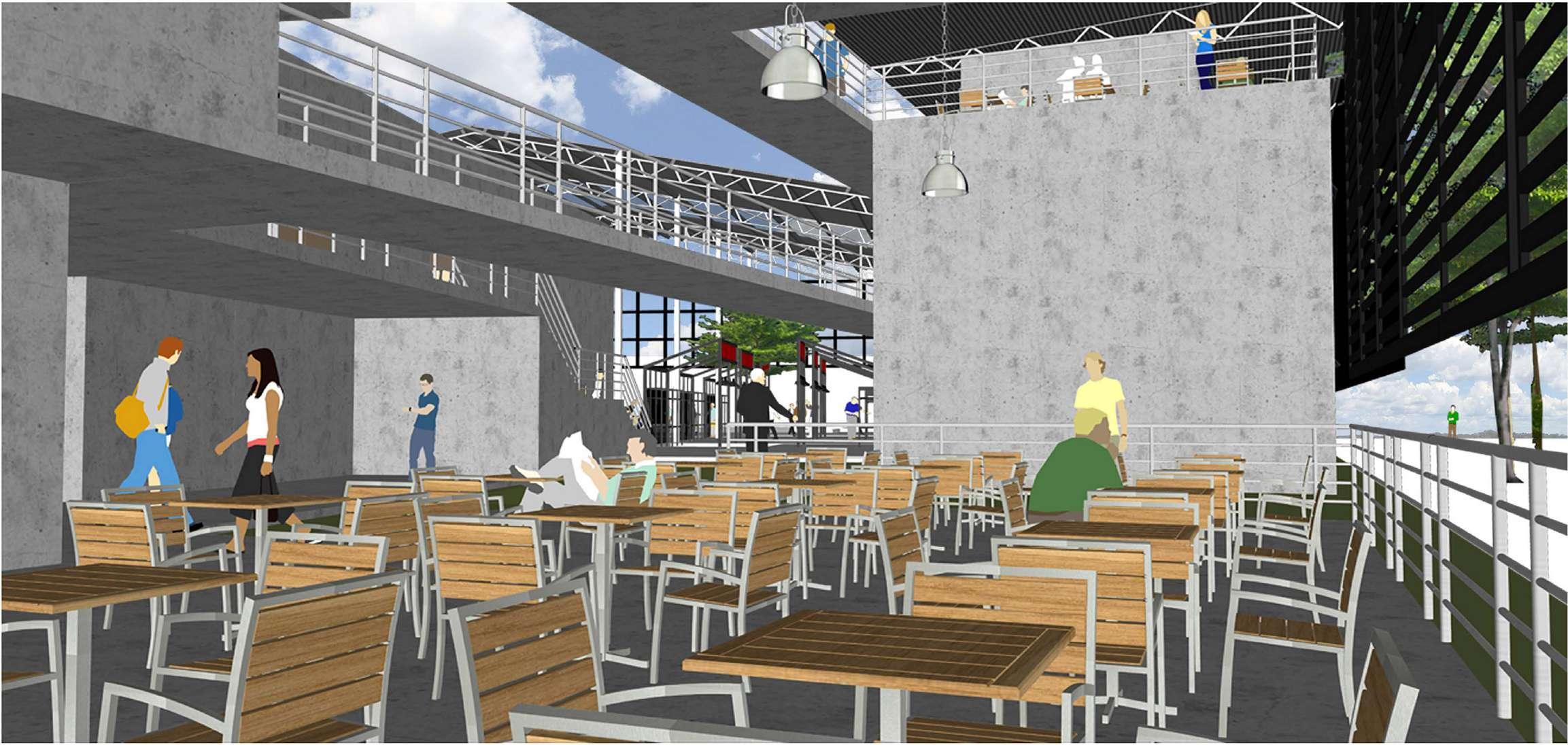 Being designed as a porous volume to encourage for visual interaction from and into the cafe. Users can enjoy the views to the football field at the northern part of the building while savouring their food or just chilling out at the cafe.