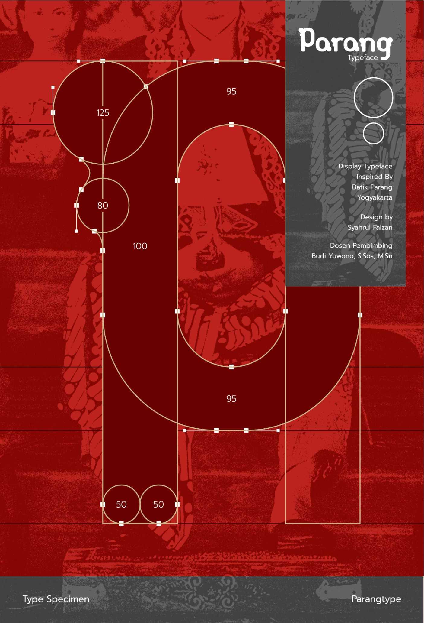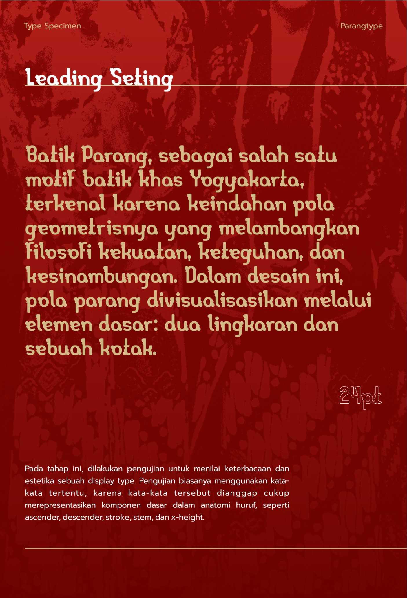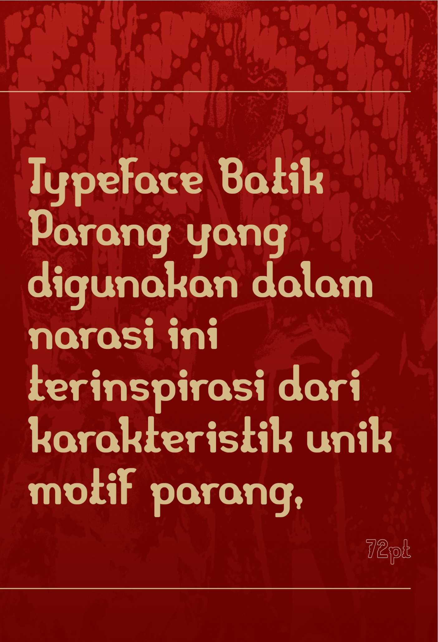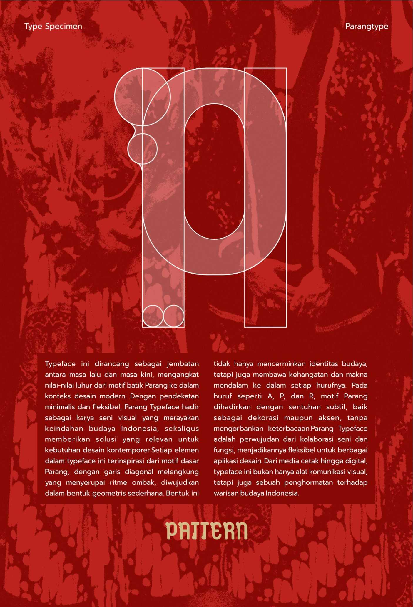 Parang Display adalah sebuah typeface display modern yang terinspirasi oleh pola tradisional batik Parang, salah satu motif tertua dan paling ikonik dari Indonesia. Typeface ini memadukan keindahan elemen tradisional dengan desain kontemporer, menciptakan huruf yang kuat, dinamis, dan berkarakter. Dengan garis tegas dan bentuk geometris yang menyerupai lekukan gelombang parang, typeface ini dirancang untuk memberikan kontras yang kuat dan daya tarik visual yang mencolok. Karakteristiknya yang unik membawa elemen budaya lokal ke dalam desain modern, menjadikannya pilihan sempurna untuk berbagai kebutuhan kreatif, seperti judul, poster, branding, atau proyek desain digital. Type specimen dari Parang Display menampilkan fleksibilitas dan estetika dari font ini melalui eksplorasi visual yang kreatif, termasuk aplikasi pada layout poster, sampul buku, hingga desain digital. Specimen ini tidak hanya memperlihatkan sisi teknis dari typeface, tetapi juga menginspirasi desainer untuk menggali potensi kreatifnya lebih
