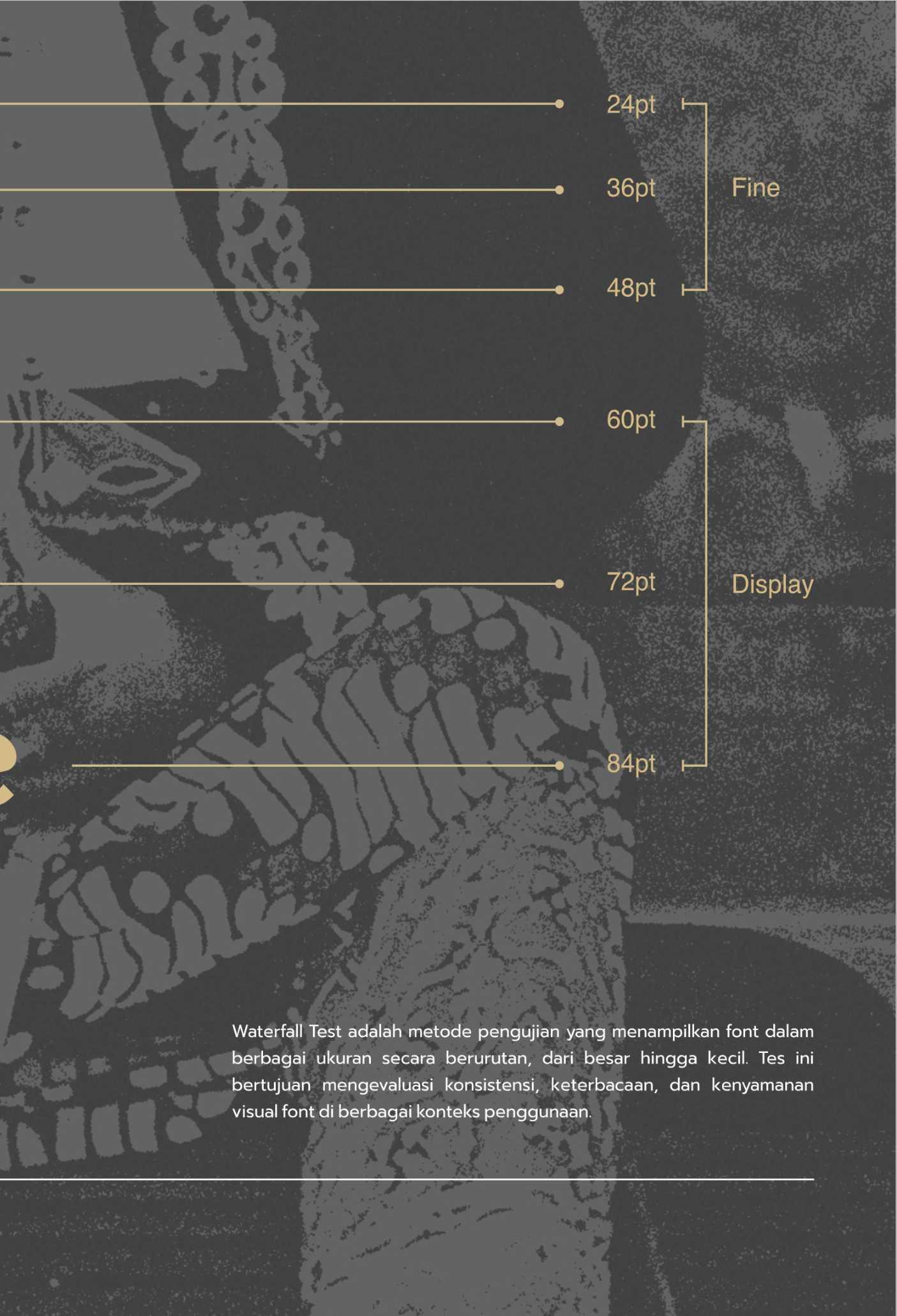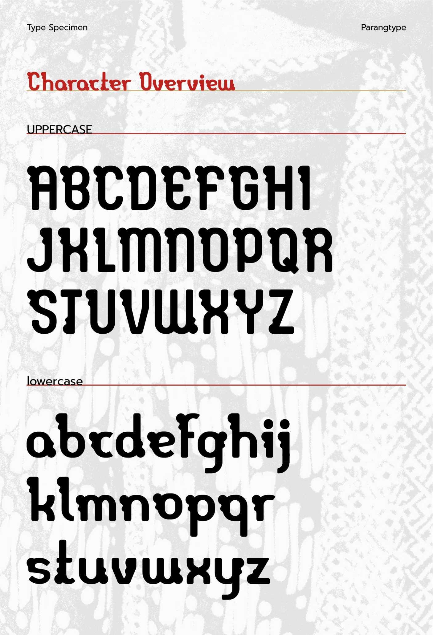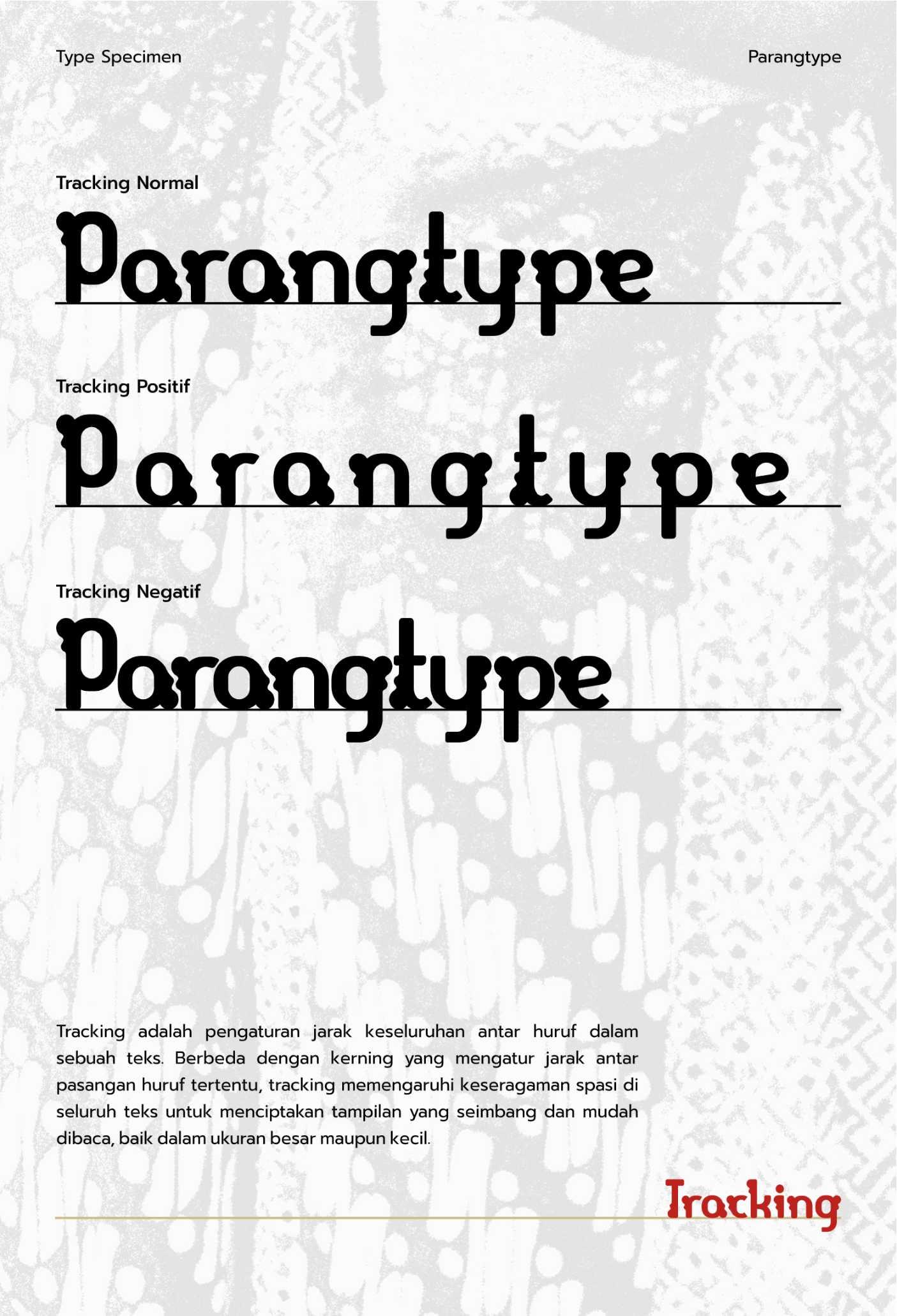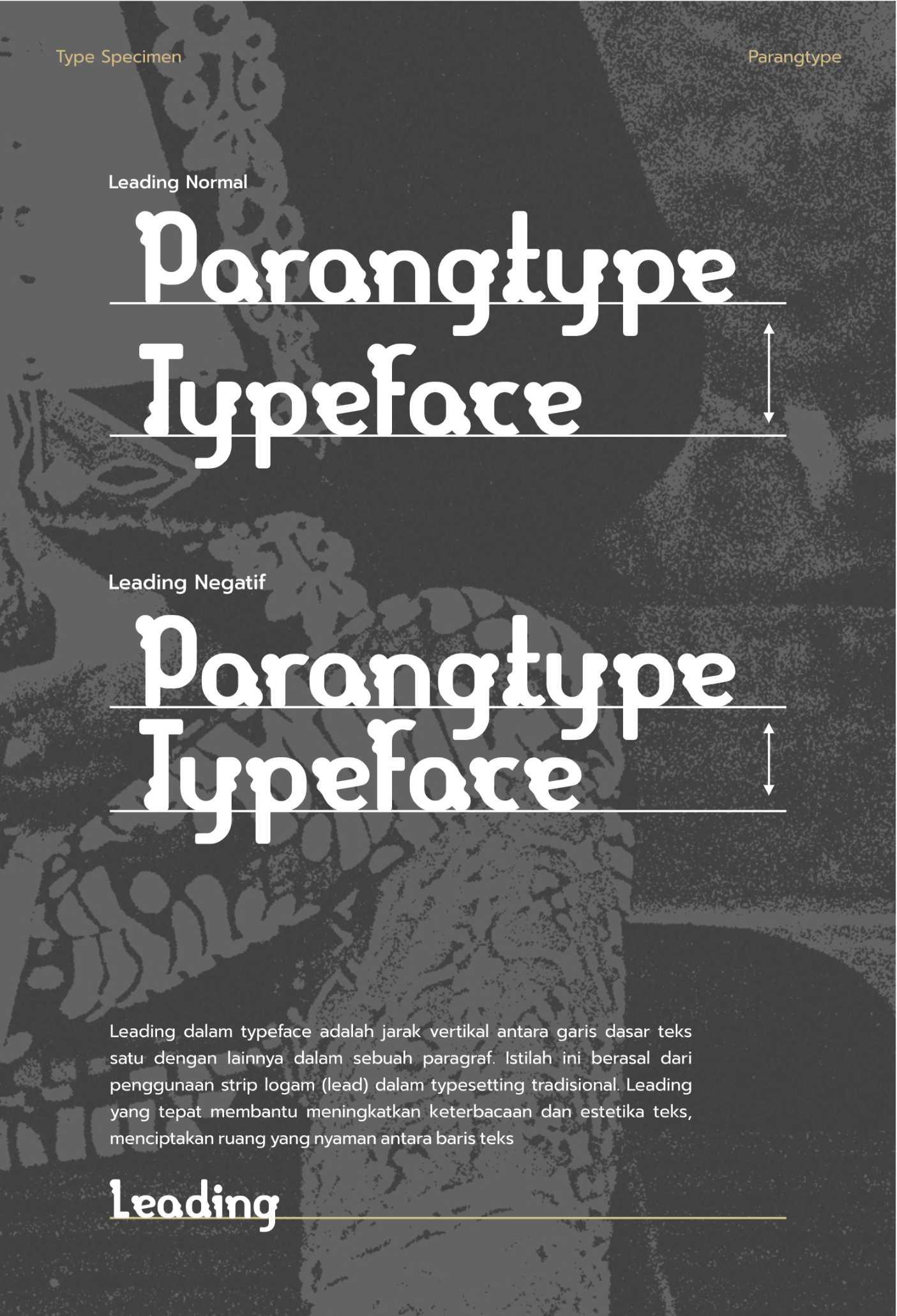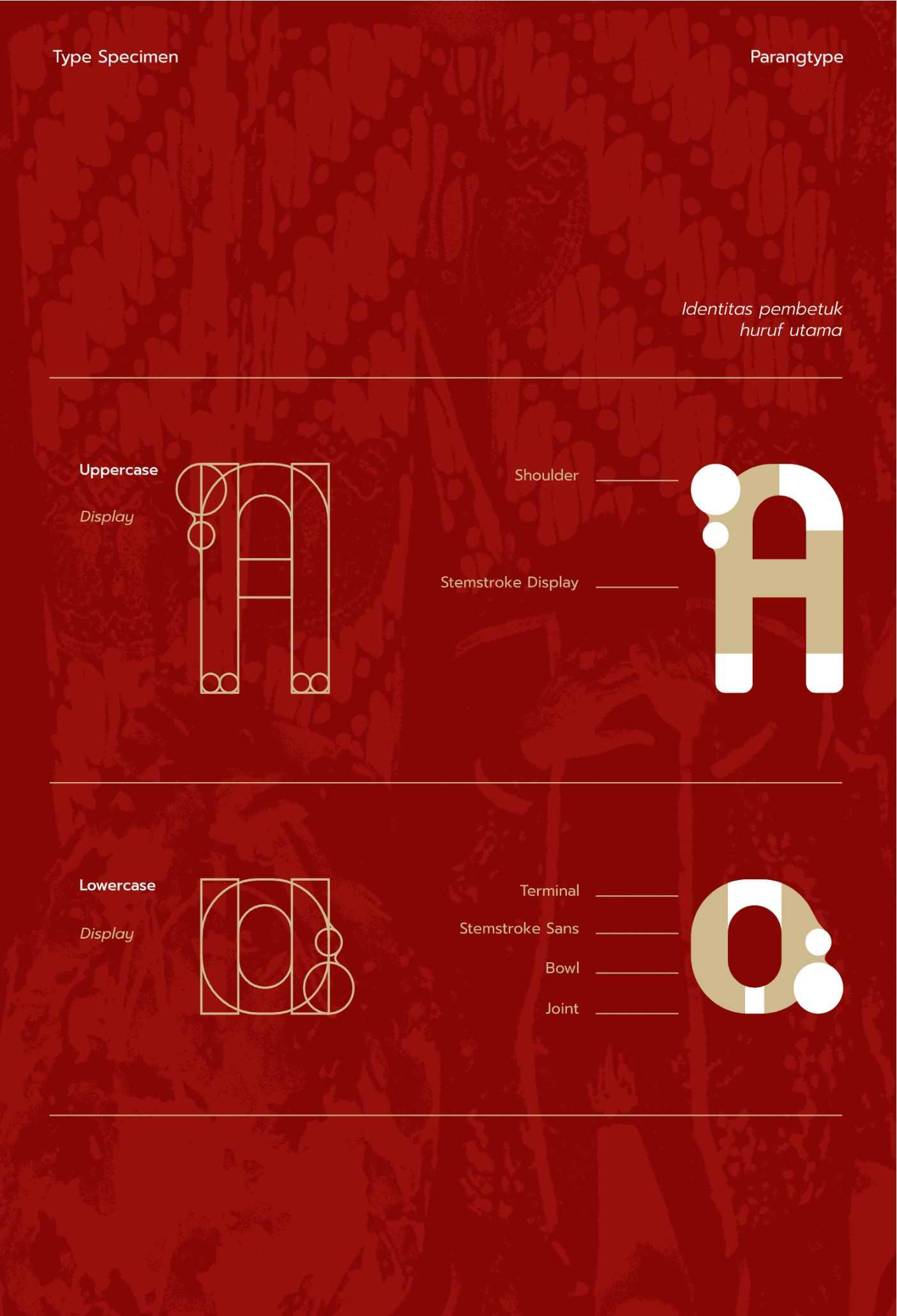 Parang Display adalah sebuah typeface display modern yang terinspirasi oleh pola tradisional batik Parang, salah satu motif tertua dan paling ikonik dari Indonesia. Typeface ini memadukan keindahan elemen tradisional dengan desain kontemporer, menciptakan huruf yang kuat, dinamis, dan berkarakter. Dengan garis tegas dan bentuk geometris yang menyerupai lekukan gelombang parang, typeface ini dirancang untuk memberikan kontras yang kuat dan daya tarik visual yang mencolok. Karakteristiknya yang unik membawa elemen budaya lokal ke dalam desain modern, menjadikannya pilihan sempurna untuk berbagai kebutuhan kreatif, seperti judul, poster, branding, atau proyek desain digital. Type specimen dari Parang Display menampilkan fleksibilitas dan estetika dari font ini melalui eksplorasi visual yang kreatif, termasuk aplikasi pada layout poster, sampul buku, hingga desain digital. Specimen ini tidak hanya memperlihatkan sisi teknis dari typeface, tetapi juga menginspirasi desainer untuk menggali potensi kreatifnya lebih