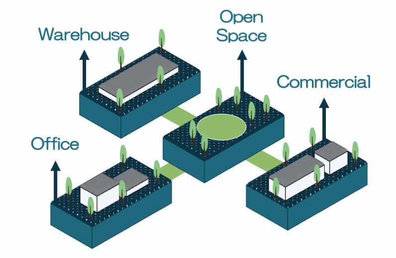 Konsep ruang terbuka dibuat terintegrasi dengan memperhatikan jalur hijau berupa penghubung kawasan yang dibuat continuous