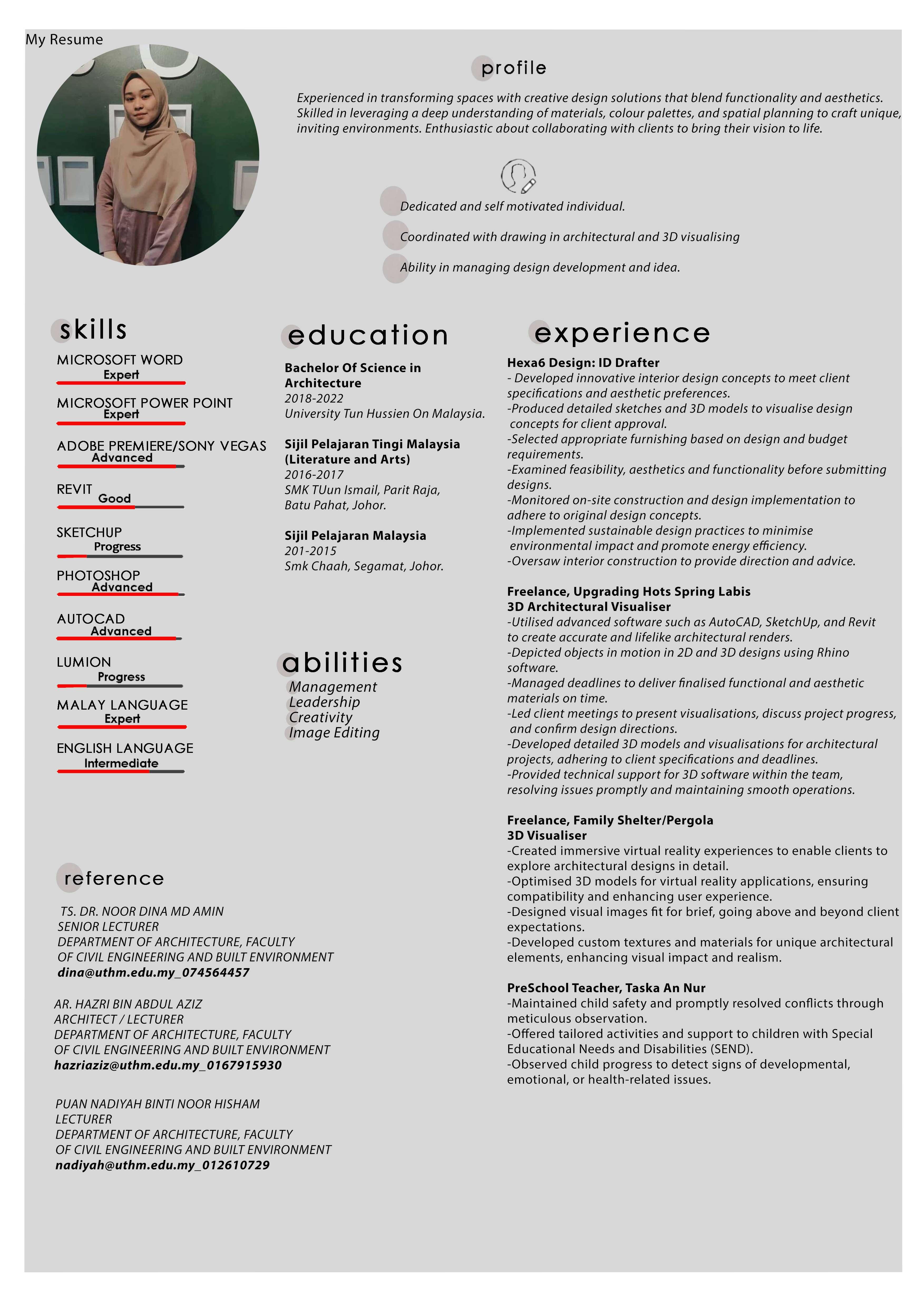A recent graduate with a Bachelor of Science in Architecture, I am a highly motivated and dedicated individual with a passion for design and problem-solving. Throughout my academic journey, I have developed a strong foundation in architectural theory, design principles, and technical skills. I thrive in collaborative environments and am eager to contribute to innovative projects while continuously learning and growing as a professional. With a keen eye for detail and a commitment to excellence, I am ready to take on new challenges and make a positive impact in the field of architecture.
