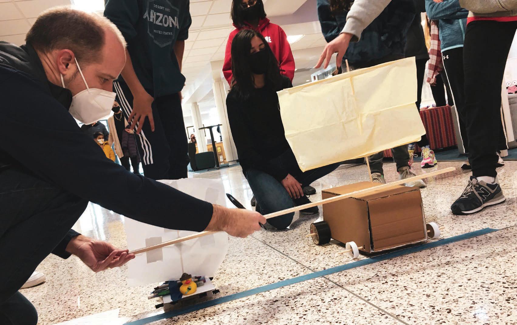 David Schuth checks the measurements and starting positions for the wind powered studentconstructed vehicles. Human Body and Wind Power have their start in the Early Childhood science projects. The line that runs through the grades is an important part of the building of a curriculum, and the teamwork among the Early Childhood, Lower School, and Middle School leaders makes sure that the consistency stays in place as new ideas are implemented. “While particular units of study may change, foundational beliefs remain strong,” says Williams. “From the beginning, Sycamore has always embraced the philosophy that gifted students of all ages should be given regular opportunities in the sciences to go deeper, think bigger, and connect to real world experiences.” Williams, who spent 23 years as a Kindergarten teacher at Sycamore before assuming the role of Head of Early Childhood, says in each grade level throughout Early Childhood, students are presented units in the Physical, Life, Earth, and Space Sciences. “Integrated throughout the units are elements of engineering, technology, and applications of science. This ensures our youngest students have experiences in a variety of topics. It also aligns with the national Next Generation Science Standards.”