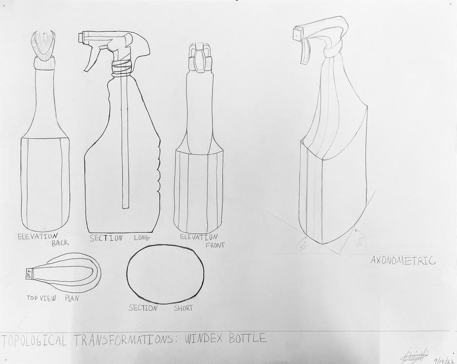 This project focused on exploring everyday household items and representing the object in different full-scale models using cardboard. The models shown on the side were constructed using technics like vertical stacking, wire bending, horizontal stacking, and an interlocking "eggcrate". The Windex bottle was also drafted through axonometric and orthographic drawings.
