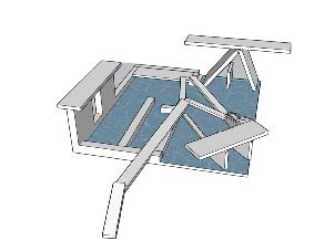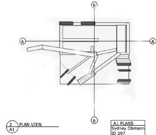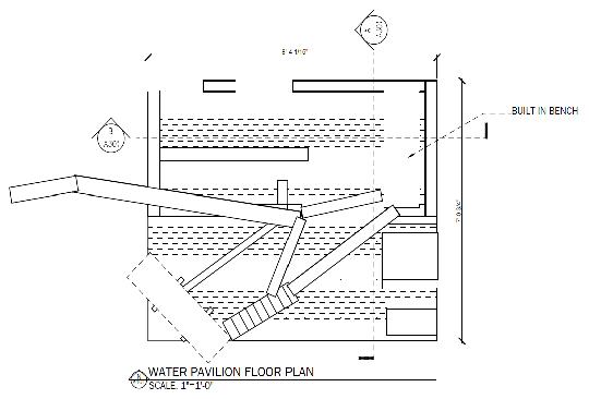Shown below are a variety of different floor plans that include section cut lines and accurate dimensions of the water pavilion. The floor plan on the right was made in AutoCad and demonstrates all of the architectural features built. The floor plans on the right were made in Layout, demonstrating a plan view and a top view.