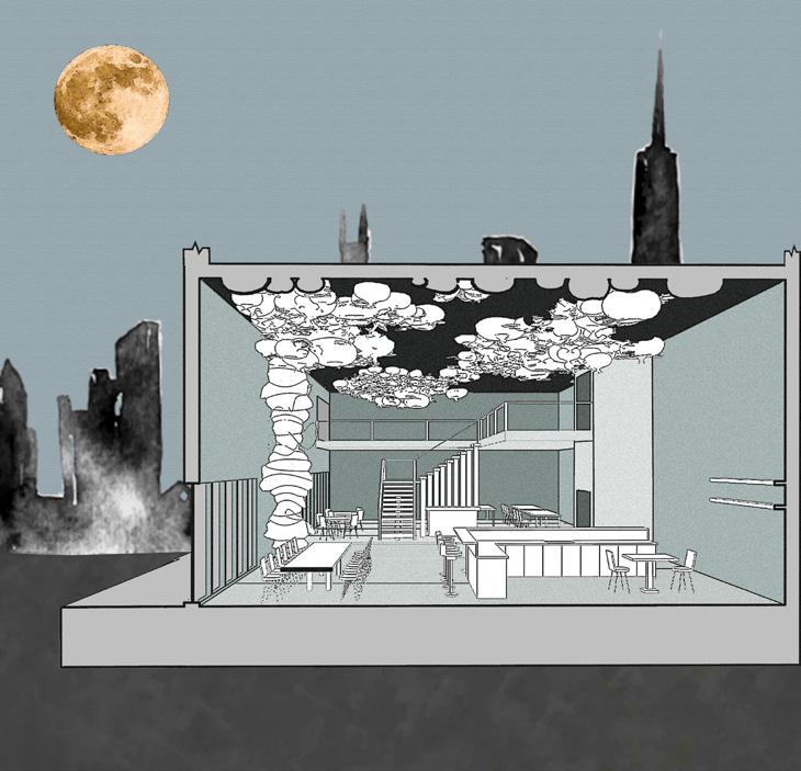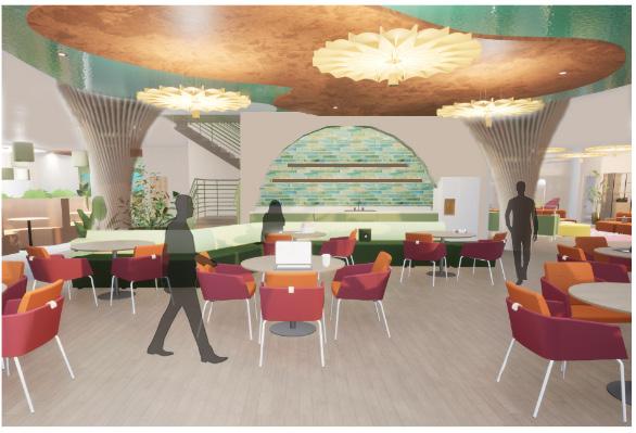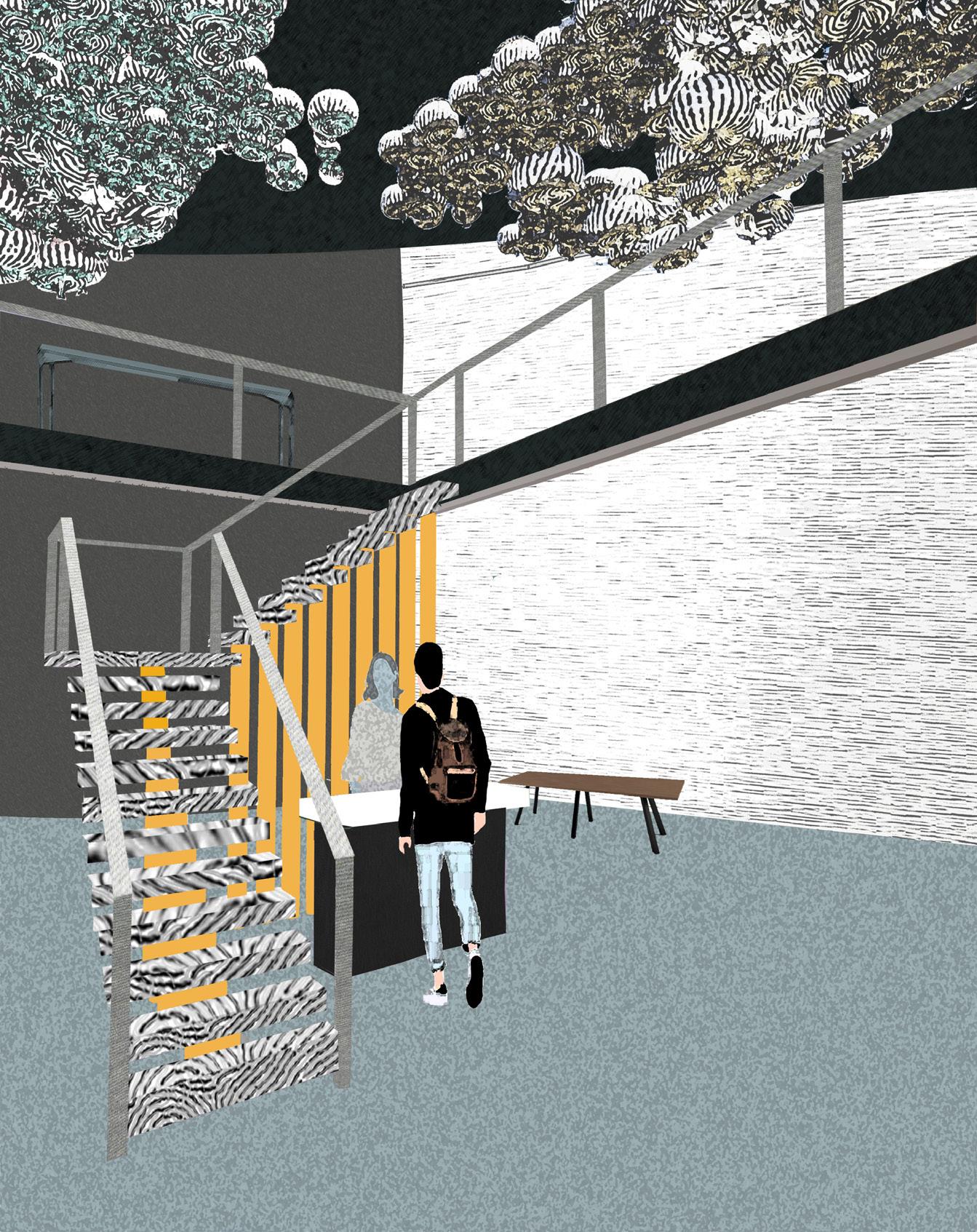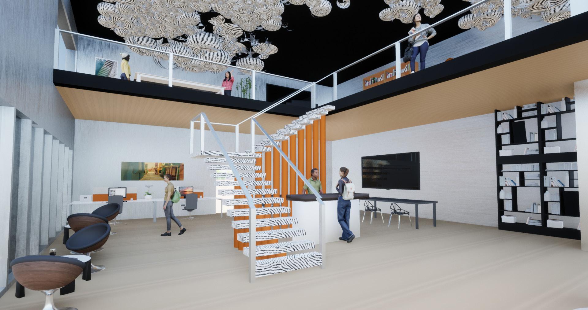 The primary focus of Evolve is to create a dynamic space for a variety of users to enjoy. Every person who walks through the doors of this environment comes from a different background and is seeking a unique experience which can change depending on the day. We wanted to create an environment which reflects the diverse and everchanging students that would use the lobby on a day-to-day basis. Organic forms and undulating patterns ebb and flow throughout the design signifying the metamorphosis that students are experiencing at this stage of life. Practicality plays a large role within the design of this space as well. As students experience the unfamiliar architecture in Evolve, they are also met with recognizable structures and objects, creating a sense of stability, comfort, and curiosity within the user. By combining these elements, we have created an environment which contrasts the evolution of life with our innate need for familiarity.