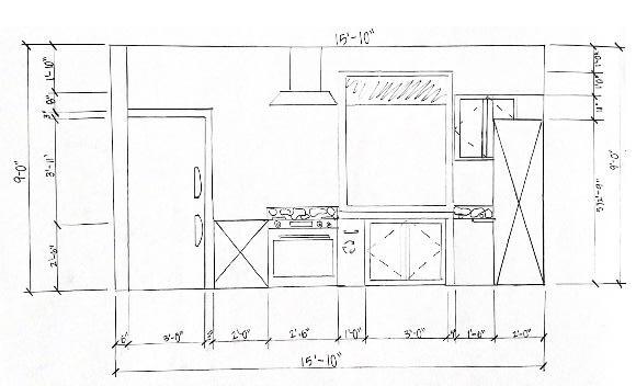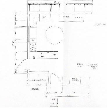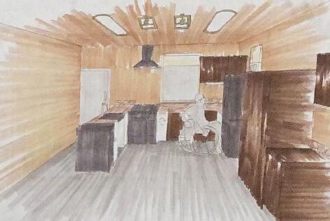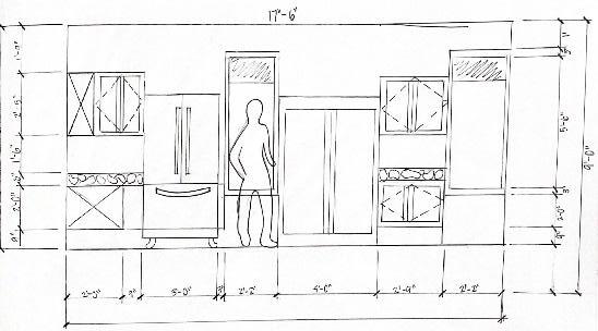 This kitchen layout is ADA compliant, shown through the two hand drawn elevations on the right. On the left is a rendered perspective demonstrating the materials chosen by the Besses.