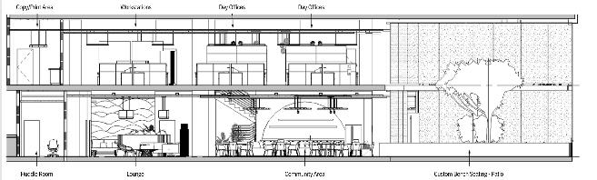 Below the rendered floor plans are the labeled construction documents that show the section cuts of the plan as well as dimensions and labeled furniture.