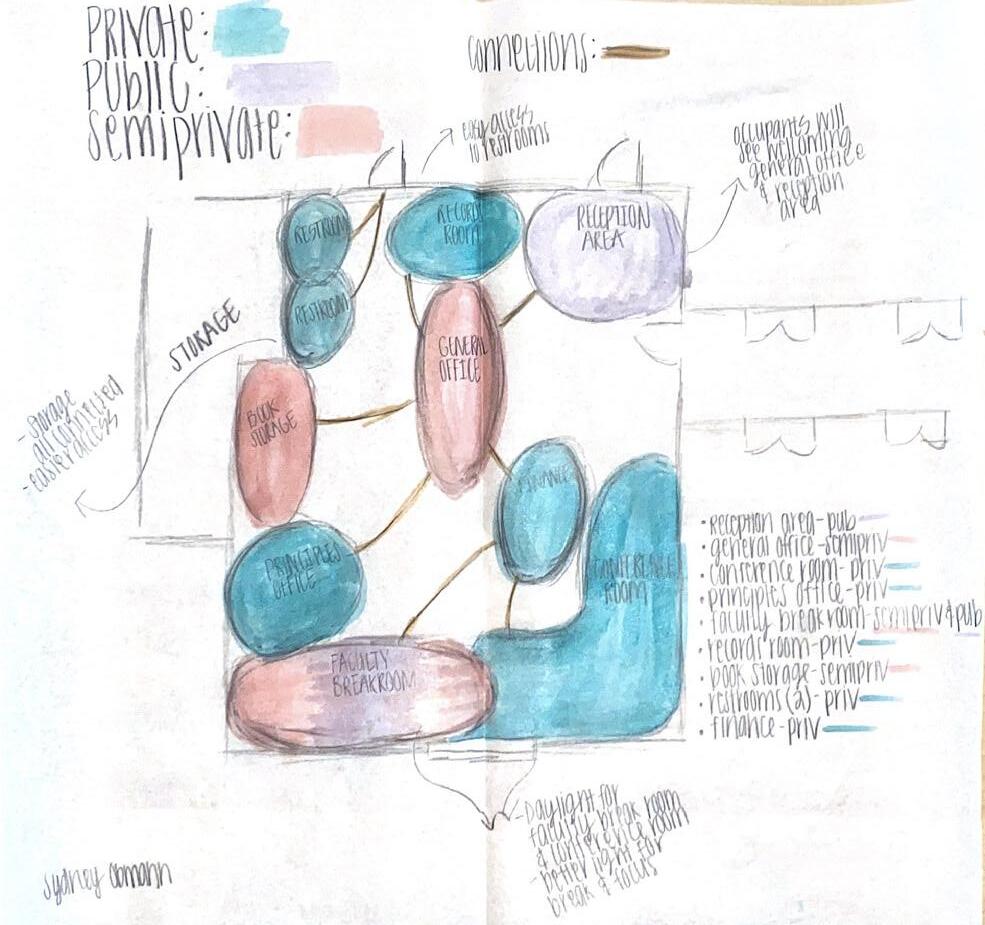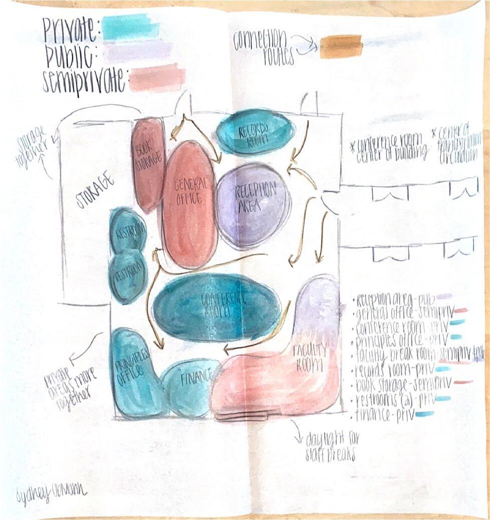 When beginning the process of designing the elementary school, for each area of the school, (the administrative office and the library shown here), bubble diagrams and blocking diagrams help further the design process before beginning the actual floor plan for the space. Through this process, adjacencies, private vs public spaces, and the most efficient space planning is discovered.