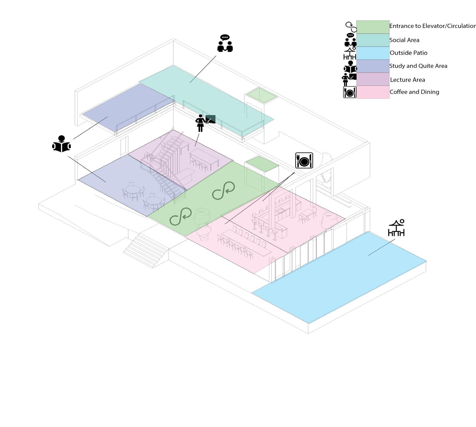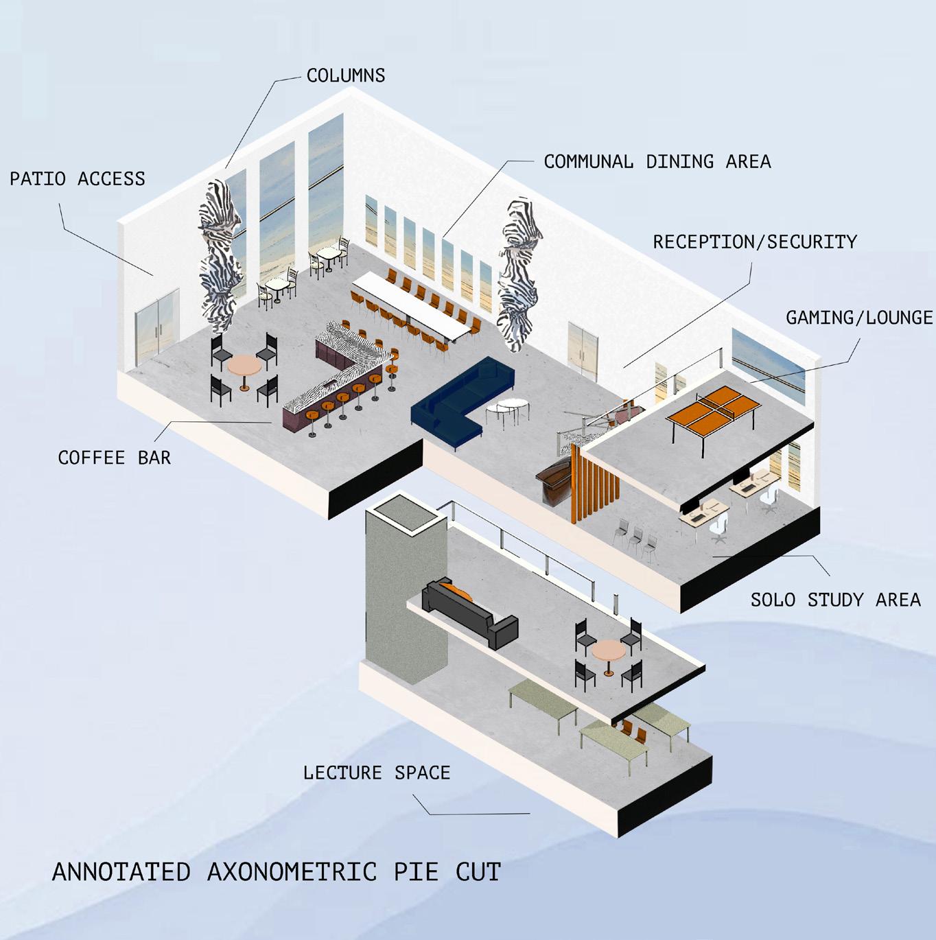 Sections and axons demonstrate parts of this design that are not represented in perspectives or areas that may be difficult to understand to the viewer’s eye in the floor plans. Including these diagrams to help to show dimension and architectural features is important in presenting this design.