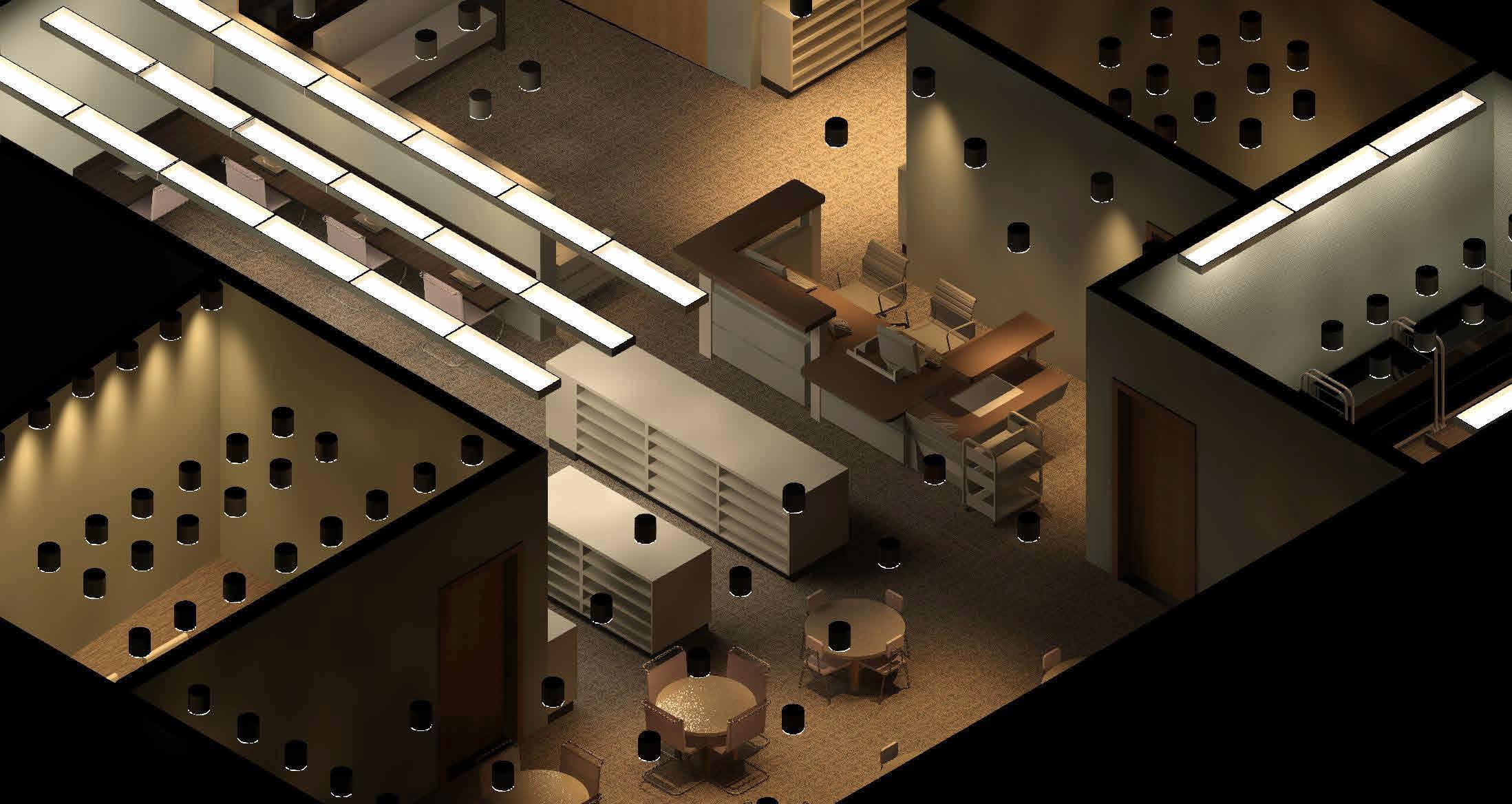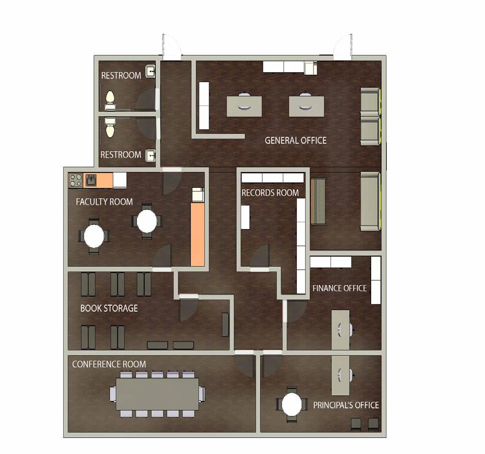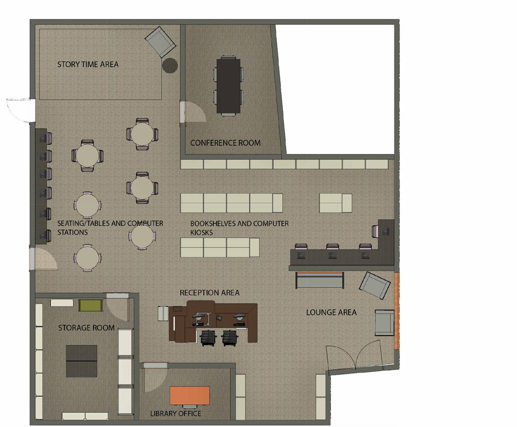 Shown here are the finished and rendered floor plans of the library and the administrative office. Two perspectives of the library are also shown here, showcasing the lighting fixtures and layout of the seating area, computer stations, and custom made reception desk.
