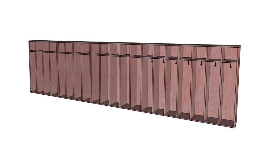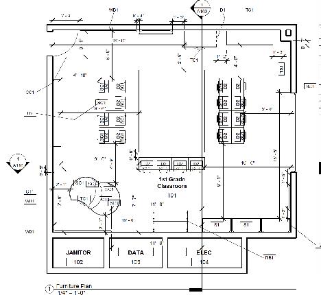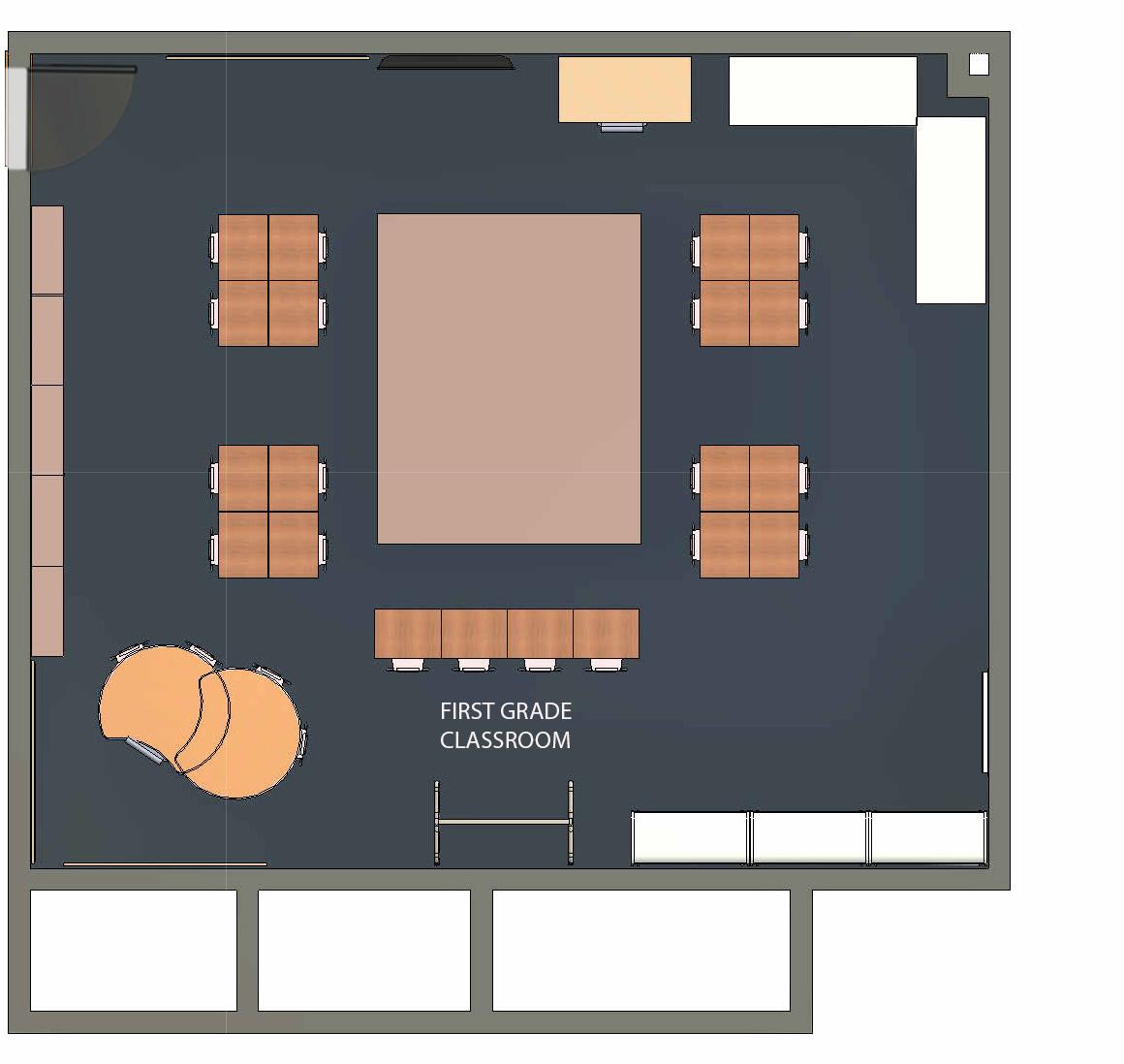 Shown here is the finished and rendered floor plan of the first grade classroom as well as two rendered perspectives showcasing the custom made cubbies, storage, and entire layout of the classroom.