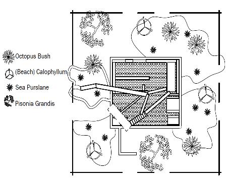 Shown on the left, is a rendered plan view of the landscape design of the pavilion. The landscape plan shows the different materials of the pavilion that is shown throughout the other renderings. This plan includes the different types of plants and nature from Cocos Islands best represented through Photoshop, as well as the gravel pathways throughout the landscape. Shown on the right is a detailed landscape plan view created in AutoCad.