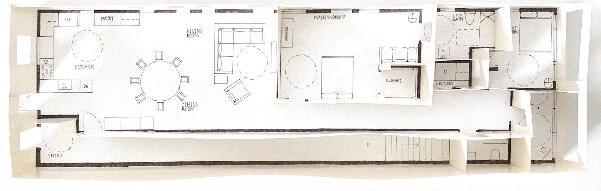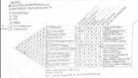 The two hand drawn floor plans on the top show The Besse bathroom floor plan and kitchen floor plan. These two plans demonstrate an ADA compliant kitchen and bathroom, specifically the bathroom due to Jim’s wheelchair. The physcial model on the bottom shows the entire apartment floor plan and the built walls around its interior and perimeter.