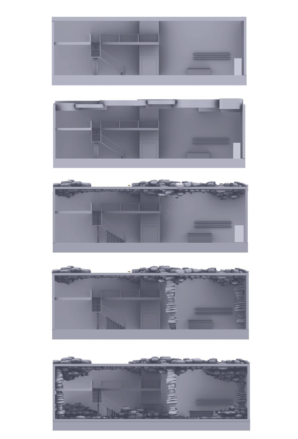 The columns shown below were created in VR, as well as a physcial model, and were further developed into a various amount of columns throughout the lobby. The five process pictures on the far right show how these columns were inserted into the lobby and how they developed into the ceiling, leading to a major part of my design concept.