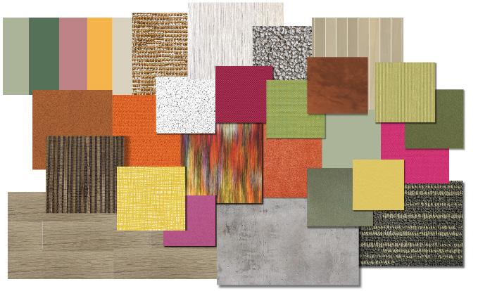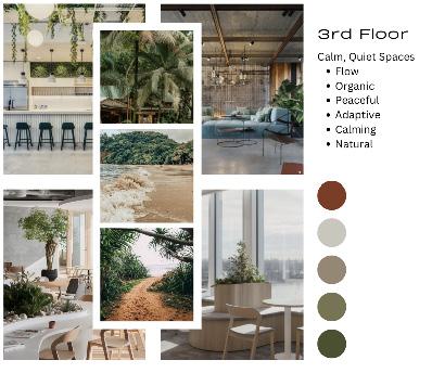 The ‘Look and Feel” Board demonstrates the concept of the third floor, showing a color pallette and architectural design ideas that could be brought into our design as well as listed characteristics of the space. The rendered third floor plan shows the materials that were used throughout the design.