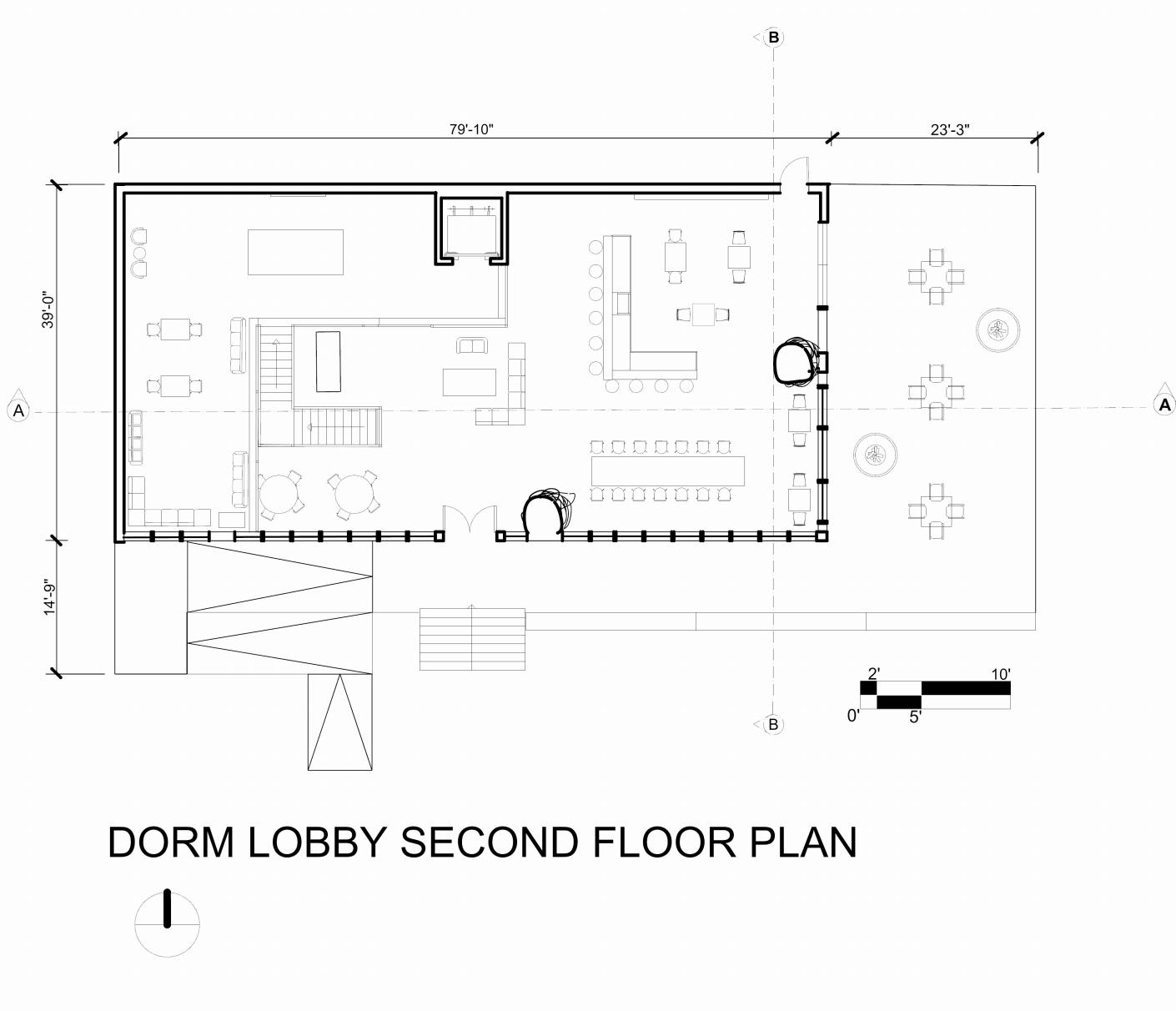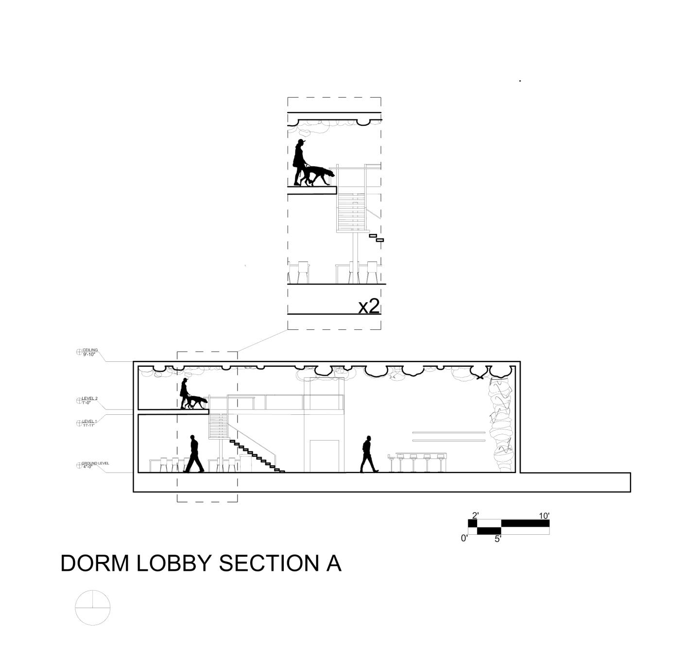 Shown here are the finished floor plans of the dorm lobby. The first floor plan is shown on the bottom left and the second floor on the bottom right. These floor plans are labeled with its accurate dimensions that also include the outdoor patio area. This page also includes a section of the lobby with a close up call out to show intriqate detail of the design as well as entourage to show accurate scale.