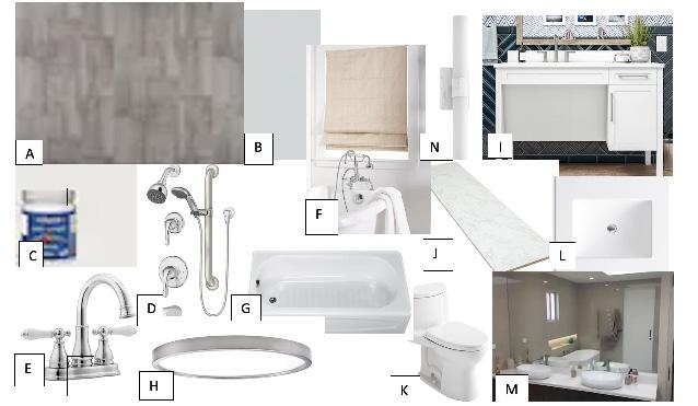 This bathroom layout is ADA compliant, shown through the two hand drawn elevations on the right. On the left is a rendered bird’s eye view perspective demonstrating the materials chosen by the Besses which is also shown through the ideas and materials palette below.
