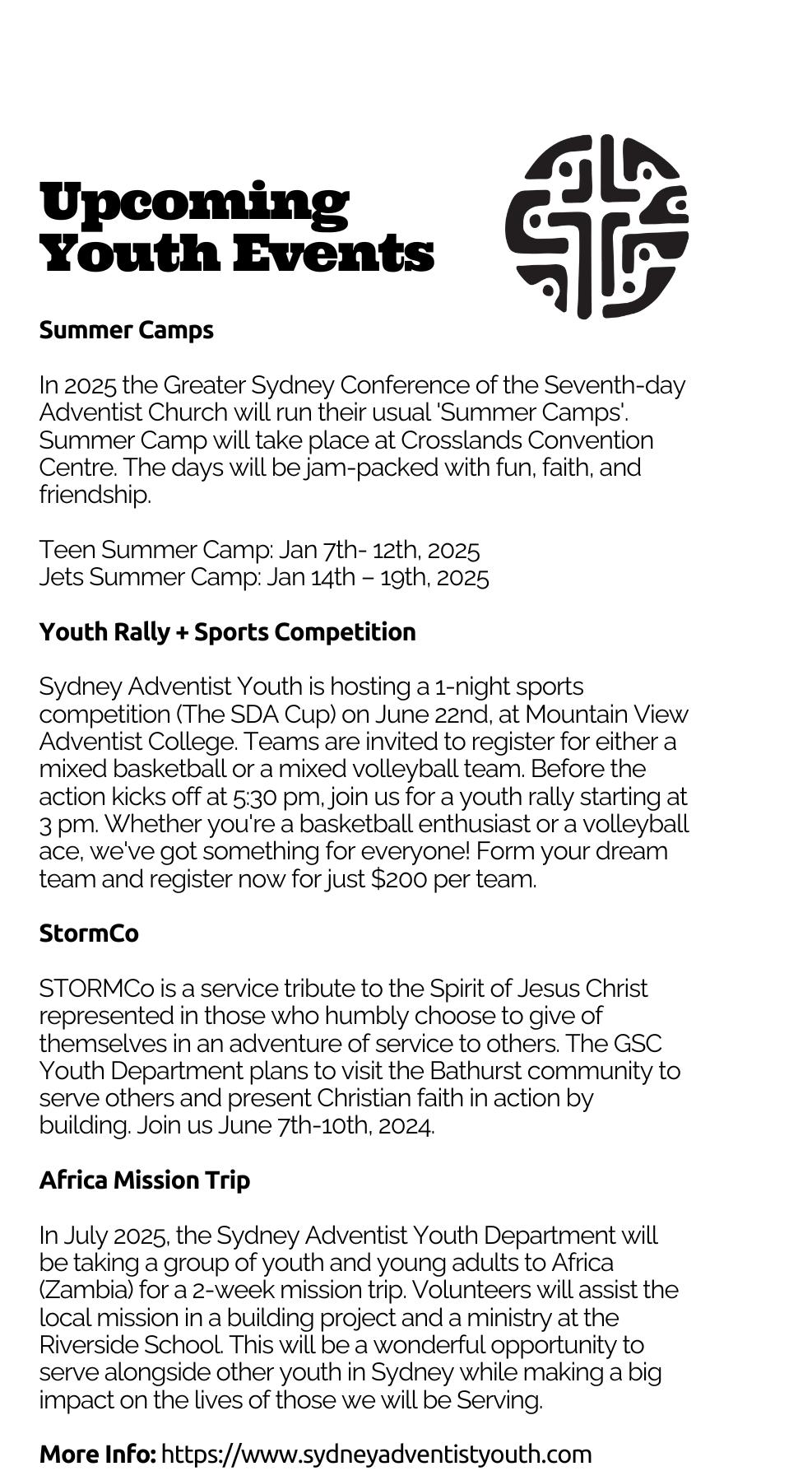 Third, the 2025 outreach campaign where Sydney Adventists return to our evangelistic roots, bringing TED-style talks back to the streets for the souls seeking salvation.