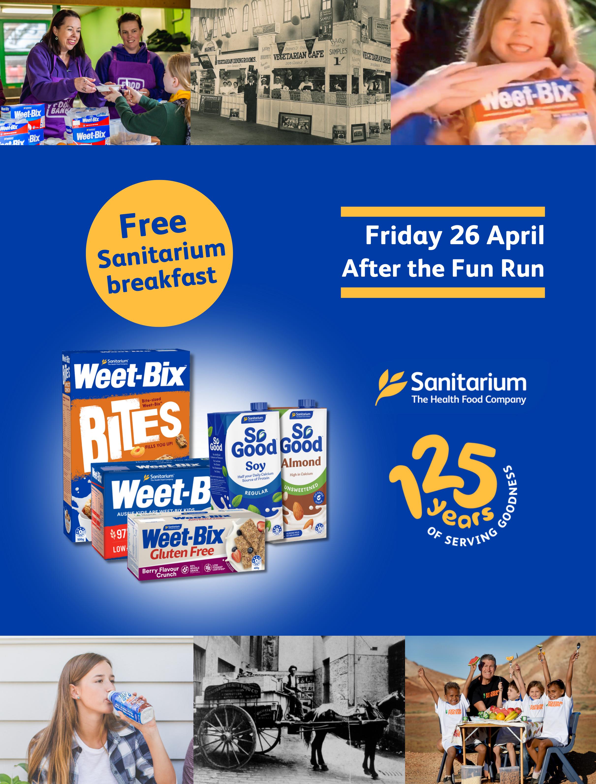 Prizes for each group. Most laps in one (1) hour win! A Sanitarium sponsored breakfast follows.
