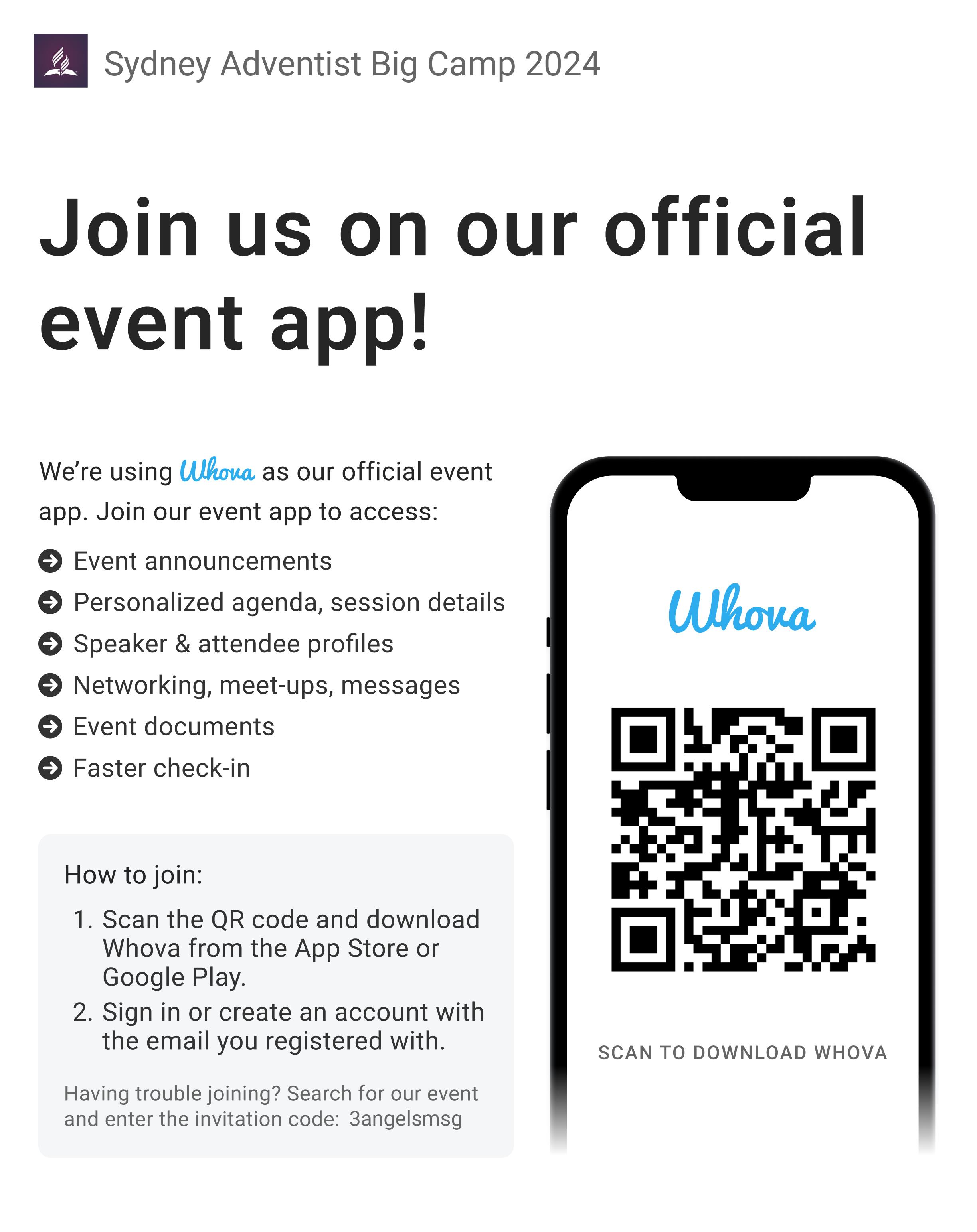 5 /sydneyadventists /sydneyadventist bit.ly/gscbigcamp TABLE OF CONTENTS 3 WELCOME 4 EVENT APP 6 CAMP INFO 11 YOUTH SUPPORT 14 SITE MAP 16 WHAT'S ON 28 OFFERING 29 BIG CAMP 2025 From our President Download it today! Follow for a Safe & Enjoyable Time at Big Camp Resources for Supporting Our Kids & Youth Find Your Way Schedule of Events Camp Offering Info & Feedback Survey Expressions of Interest Form