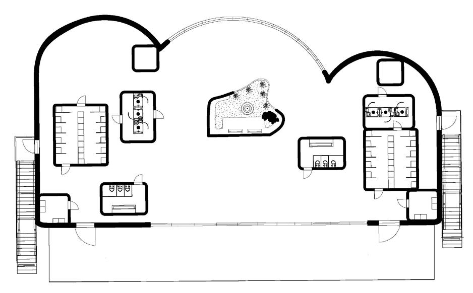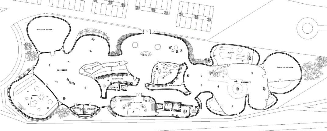 Floor plan of the ground level showing the art center’s interior and the site design