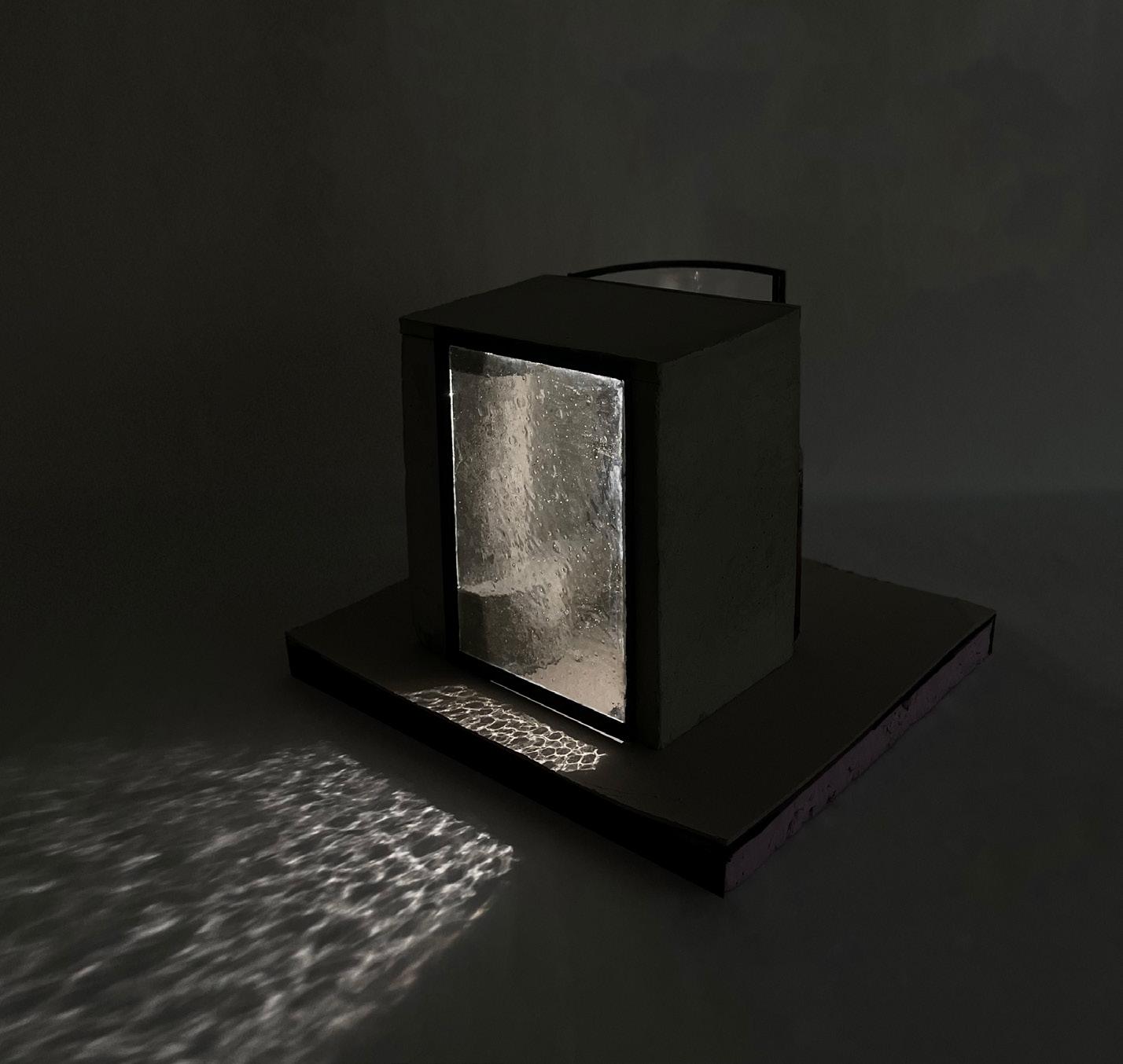 Model of the field house shower design showing the materiality and light reflection in dim lighting