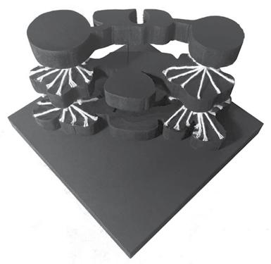 Rendered topography model Exploded axonometric drawing of the topography design elements