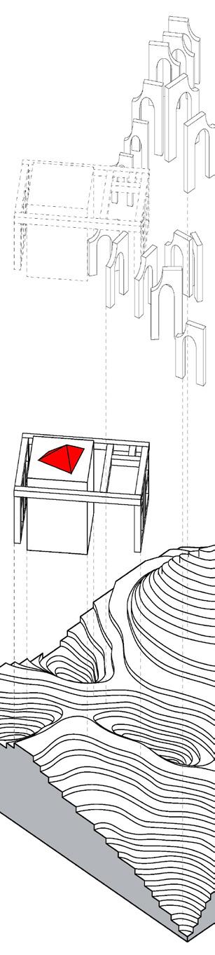 THE DEVELOPMENT OF THIS DESIGN REQUIRED AN IN-DEPTH EXPLORATION OF THE PRINCIPLES AND PRACTICAL APPLICATION OF TOPOGRAPHY. THE OBJECTIVE WAS TO MANIPULATE AND INTEGRATE TOPOGRAPHICAL FEATURES INTO THE DESIGN OF ONE OR MULTIPLE STRUCTURES. THE GUIDING FRAMEWORK FOR SHAPING THE TOPOGRAPHY WAS DERIVED FROM A THOROUGH ANALYSIS OF A SELECTED SONG. SUBSEQUENTLY, THE ENSUING PHASE OF THE PROJECT ENTAILED THE DEVELOPMENT OF STRUCTURAL FORMS, INTRICATELY INFLUENCED BY THE THEMATIC ELEMENTS OF THE CHOSEN SONG