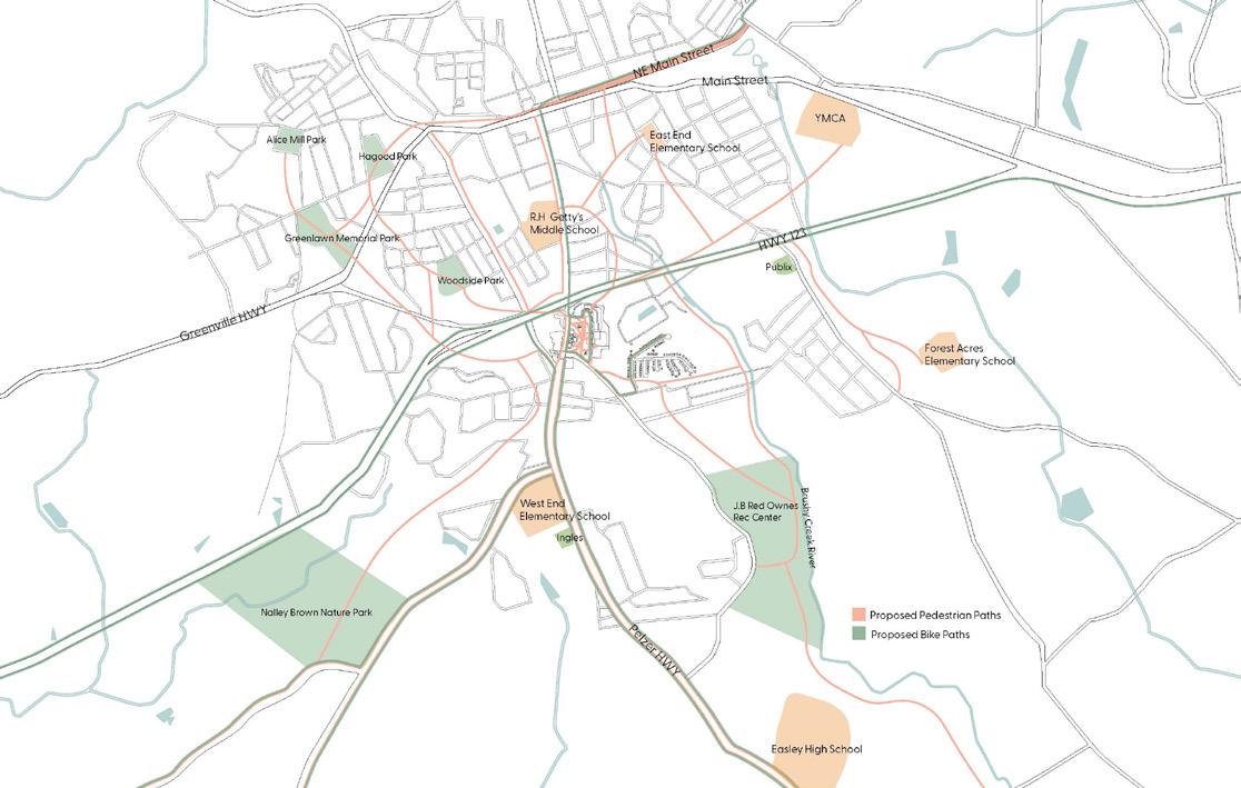 THE GOAL FOR THE BIG BOX DEVELOPMENT WAS TO FOCUS ON THE INCLUSION OF PASSIVE SPACE, COMMUNITY INTERACTION, WALKABILITY, RESOURCEFUL SPACING, STUDENT-SAFE PATHWAYS, BICYCLE PATHWAYS, AND GREENERY TARGETING THESE ASPECTS SOLVED MANY PROBLEMS IN EASLEY, SC WHICH INCLUDES LARGE SPANS OF ASPHALT GROUNDS DISCONTINUED PATHS, AND NONDISTINCTIVE WALKING AREAS. THE PLAN WAS TO GET RID OF THE EXISTING ASPAULT, WHICH CREATES MANMADE BARRIERS FOR WALKABILITY HAS NO CLEAR DIRECTION, CREATES ISOLATION, AND REDUCES GREENERY