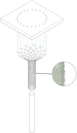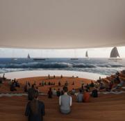 Rendering showing the curve of the mesh material of the building curve and the courtyard space