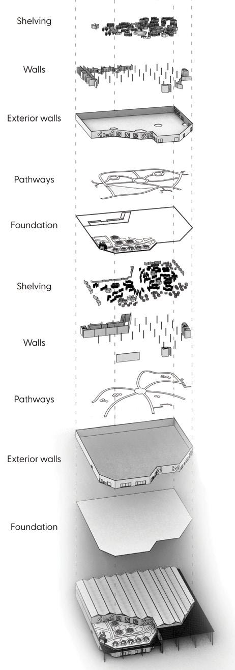 Exploded axon showing the building contents and layout