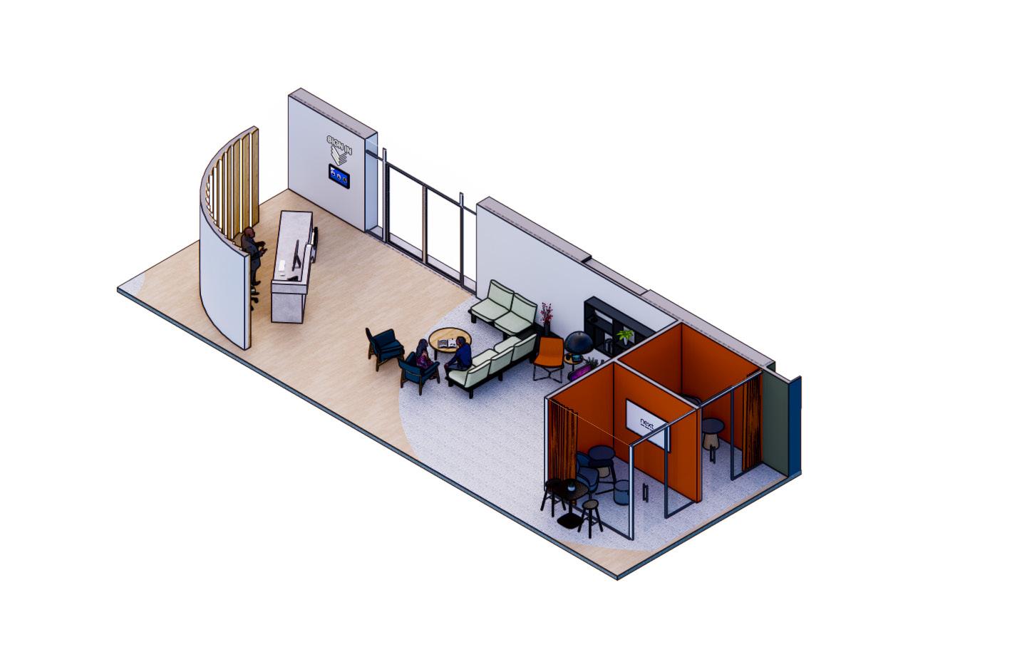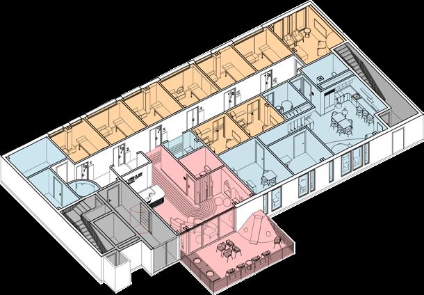 The café is the place where people refuel and grow. The café is where the strength of the company is rooted. It is the center of the workspace - from here everything grows. This is a place for employees from every role in the company to come and decompress and enjoy a meal together. The space can be used for multiple purposes.