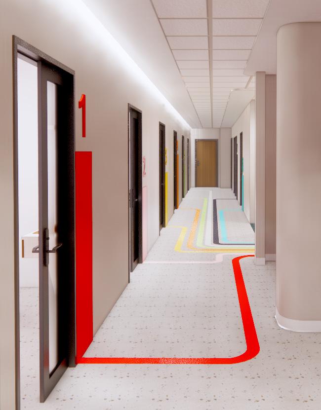 Wayfinding was implemented through interactive colored lines leading from the reception to the exam room of the appropriate color.