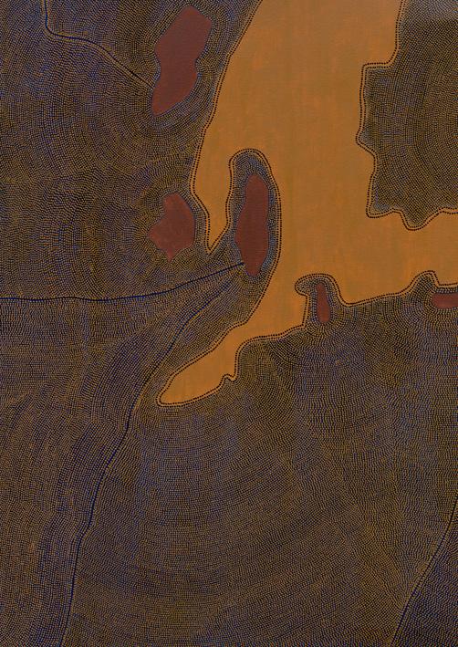 This painting, Yilabara wala (pron. ile-bar-ra wela), is my homage to both the old and new Blackwattle Bay. I have used cartography maps from the early Sydney colonial settlement with narrative from early colonial diaries to mark key sites around the cove as inspiration for this work. This has then been overlayed with the information from modern day mapping of the area to create a record of the old and new in one single body of work.