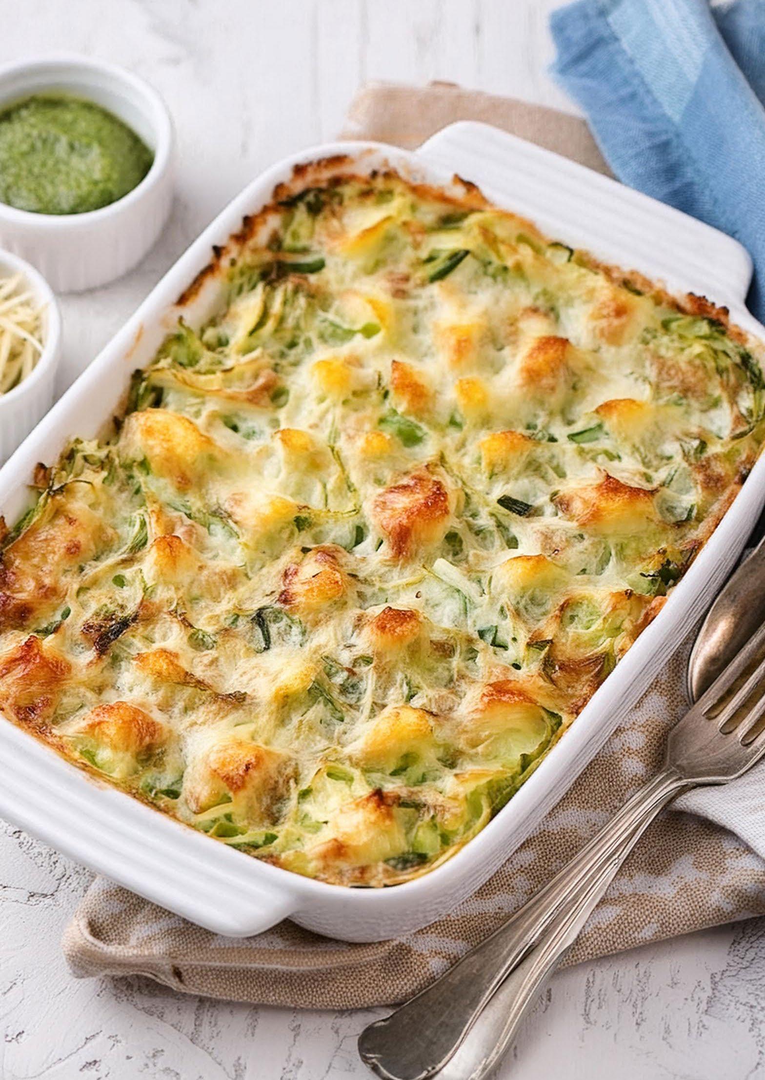 6. Dollop over the pesto and pour over the Bega cooking cream. Scatter over the remaining cheese. Bake for 25-30 minutes or until cheese is melted and golden.