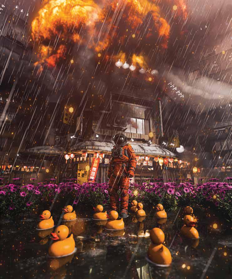 To imbue depth and atmosphere, the artist manipulated dramatic lighting and incorporated volumetric fogs through Blender's compositor. Finishing touches of raindrops and ethereal light rays were executed through Adobe Photoshop. These effects were complemented by color grading and masking in Adobe Lightroom.