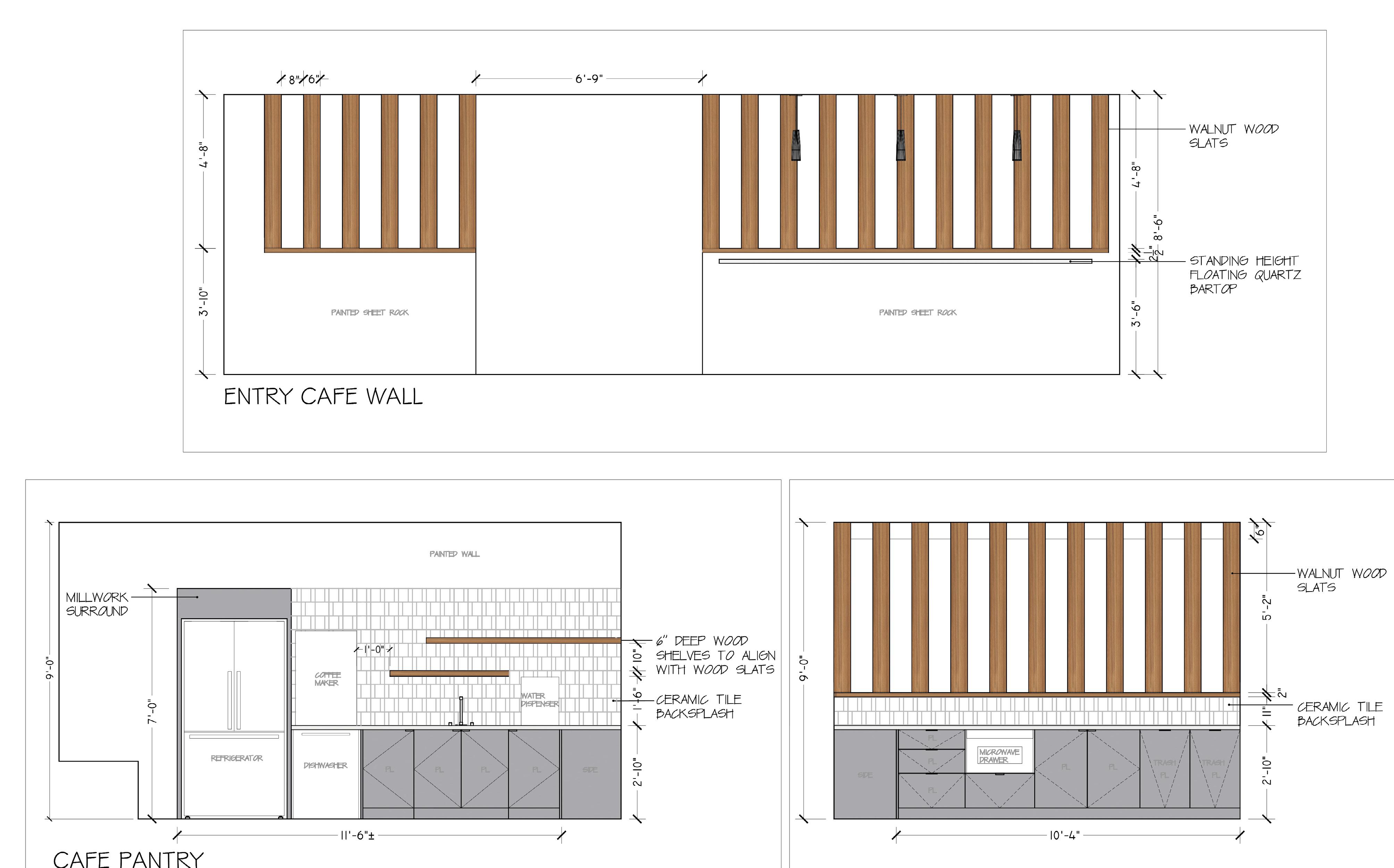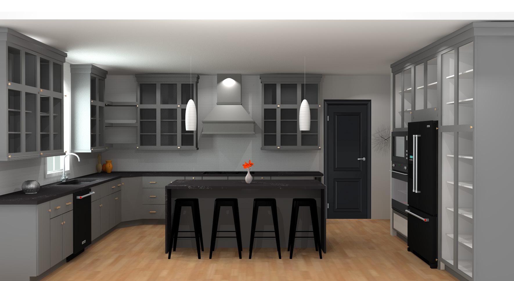 A modern monochromatic residential full kitchen renovation using Kemper Choice cabinetry, Kitchen Aid appliances and Cambria countertops with a waterfall island. The cabinetry design includes a slab door style in a grey maple matte finish. Special features include custom glass mullion door inserts, corner open shelving and a built in double oven pantry with glass inserts.
