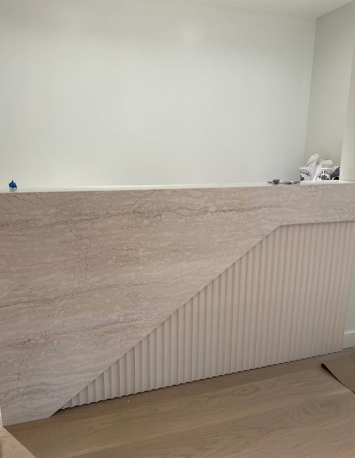 A modern residential full kitchen renovation using custom Omega cabinetry, Kitchen Aid appliances and Caesarstone counter tops with a waterfall island. The cabinetry design includes a shaker door style in a white maple finish. Special features include custom glass door inserts, ship lap paneling and a diagonal tambour corner garage cabinet.