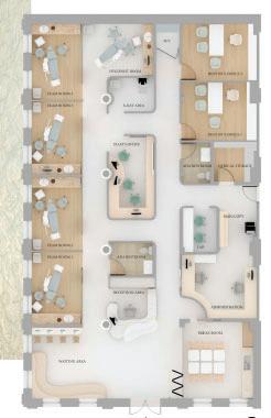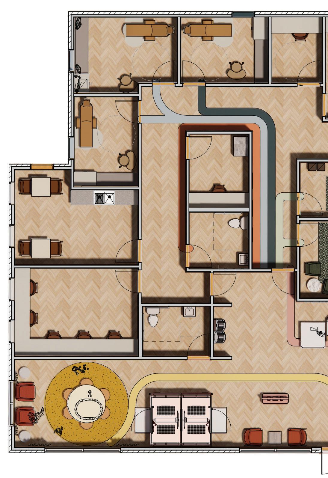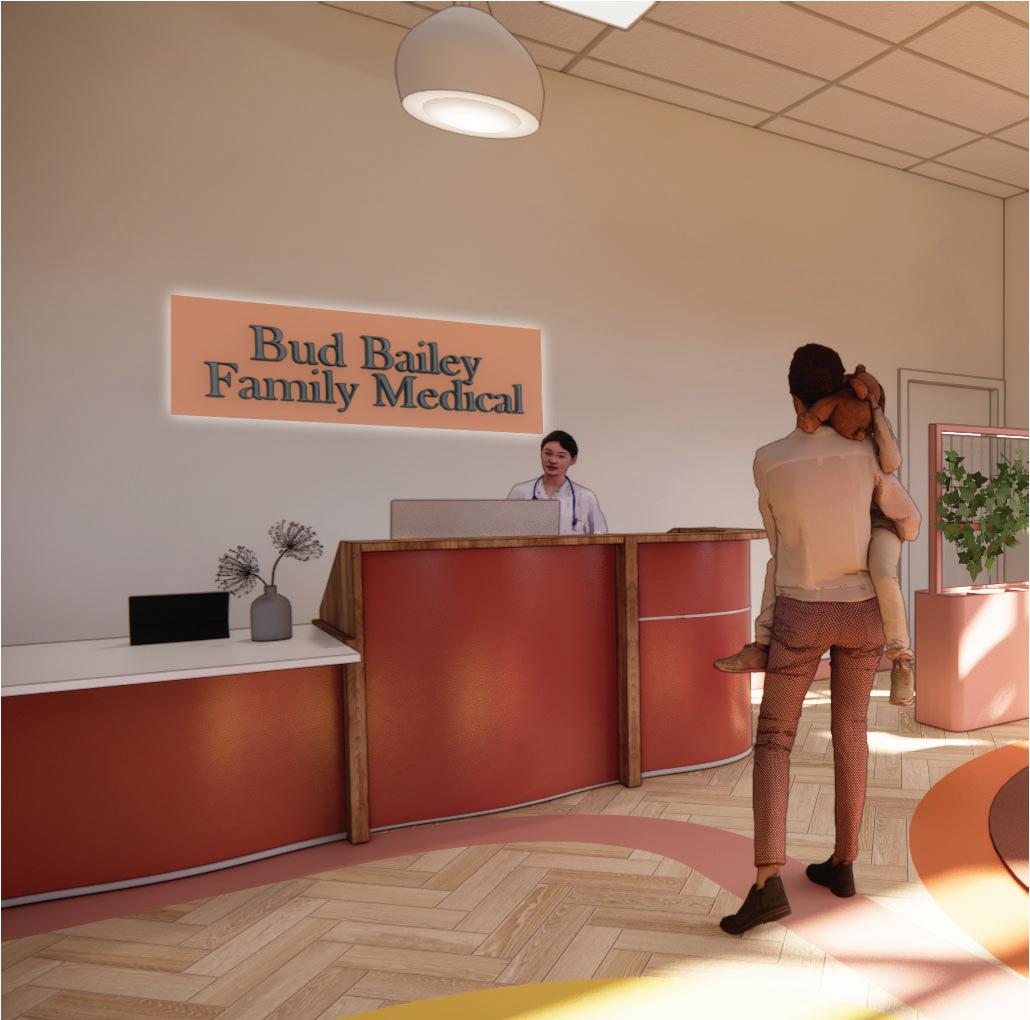 Bud Bailey Family Medical needs to provide a welcoming and communityfocused office because it will help break down cultural barriers and make medical care a more comfortable process. The reception desk is placed directly in front of the entrance to welcome clients. The waiting space is laid out similarly to a living room with a conversation area to promote the community and support system they provide each other.