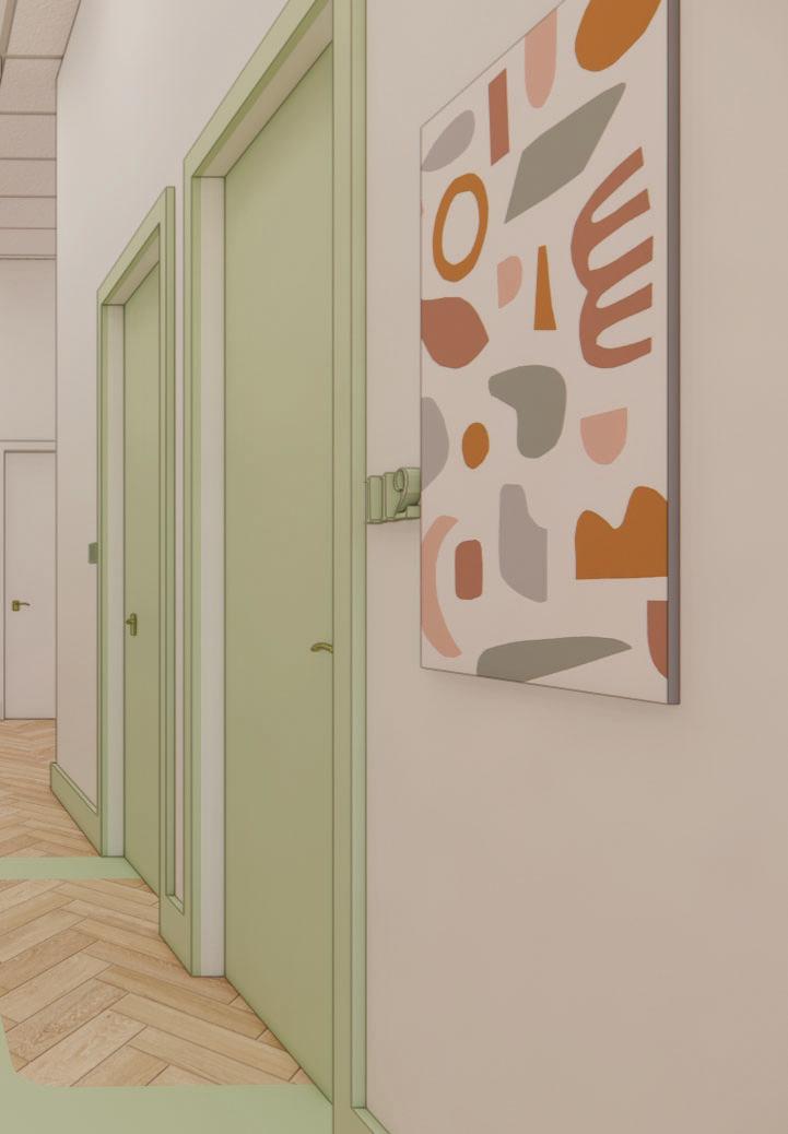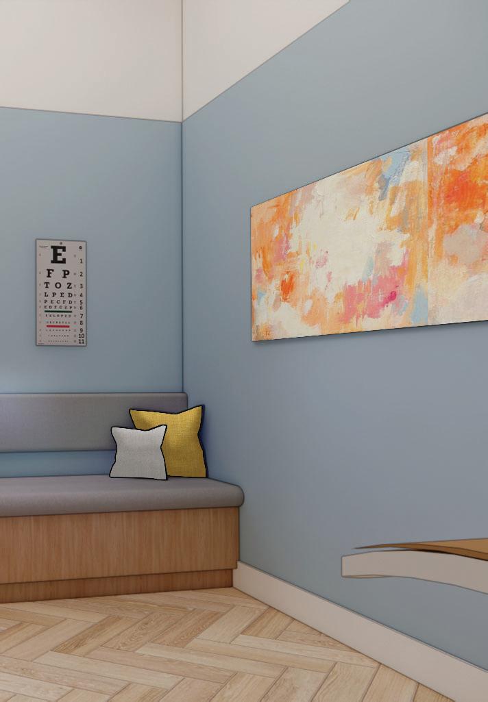 Wayfinding was one of the most critical keys to increasing the independence of Bud Bailey Family Medical users. Wayfinding is an information system that helps guide people through a space, like street signs, or maps at the mall. In this medical center, color is used as a guide. “Patients and families who visit healthcare campuses are often under stress. Wayfinding systems can help reduce their stress by providing easy-to-follow signage and legible directions to their destinations. In some settings, reliance on text-based messaging is minimized and systems rely heavily on non-text cues such as colors and symbols.” (SEGD, 2023). Using paths of color, each being associated with a different element of the center, the user can easily guide themselves to where they need to go. Yellow is assigned to the children’s space of the area, and a bright yellow path embedded in the flooring leads to the play area. Orange is assigned to the waiting space and restrooms; a path leads from the doors to the lounge and restroom doors are painted in a matching shade. Pink is assigned to the reception; it also has a path from the door to the reception desk and continues through the door to the exam rooms. Green is assigned to therapy, dark blue is assigned to dentistry, and light blue is assigned to general physicians. White is assigned as a “background” color and is used to hide away rooms like the lab and medical storage.