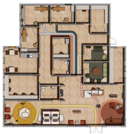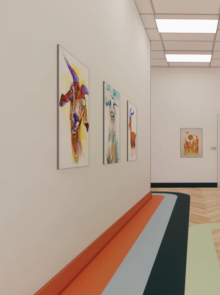 Bud Bailey Family Medical requires easy wayfinding and accessibility options to support the independence of all patients and caregivers. Colorful LVT will be placed in the wood LVT flooring to create paths throughout the office. These paths will correlate with different specialties (i.e.: general doctor, dentist, therapist), and will lead to a matching-colored door.