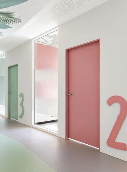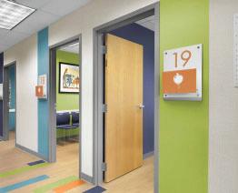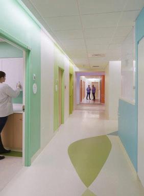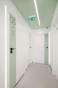 Implement bright colors on paths in the floor and on the doors, with each color associated with different rooms/procedures
