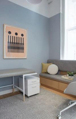 The design focus of Bud Bailey Family Medical is to create a welcoming space, increase the independence of the users, and reduce the cultural stigmas surrounding healthcare. To make the office feel welcoming, furniture and architectural finishes often found in a residential setting were selected. The waiting area of the lobby was arranged with a sofa and armchairs like a living room to create a sense of safety and home. Away from the doors, but within view of the waiting area is a children’s play area. A small table with soft poufs is an obvious signal that this space is for children and will be a safe area for them to play. Each room in the center is painted with calming pastels and lit with warm light to help people feel as comfortable as they possibly can at a doctor’s visit.