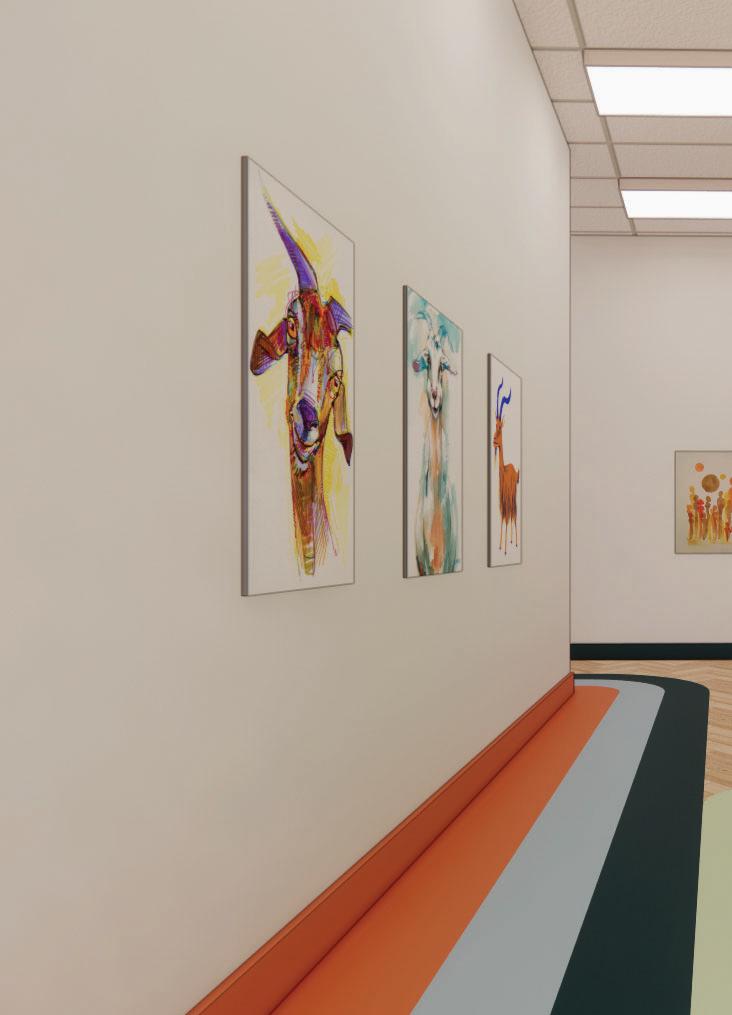 Selecting a color palette using warm color values was intentional to help aging residents who may experience a yellow tint in the eye lens. This tint makes it difficult to see cool colors like blue, purple, violet, and green. Those colors often become gray to the eye and lose contrast with their surroundings. The use of warmer tones like red, yellow, and orange create high contrast and are much easier to see, even with a yellow tint. This was the evidence behind the selection of the color palette for this facility.