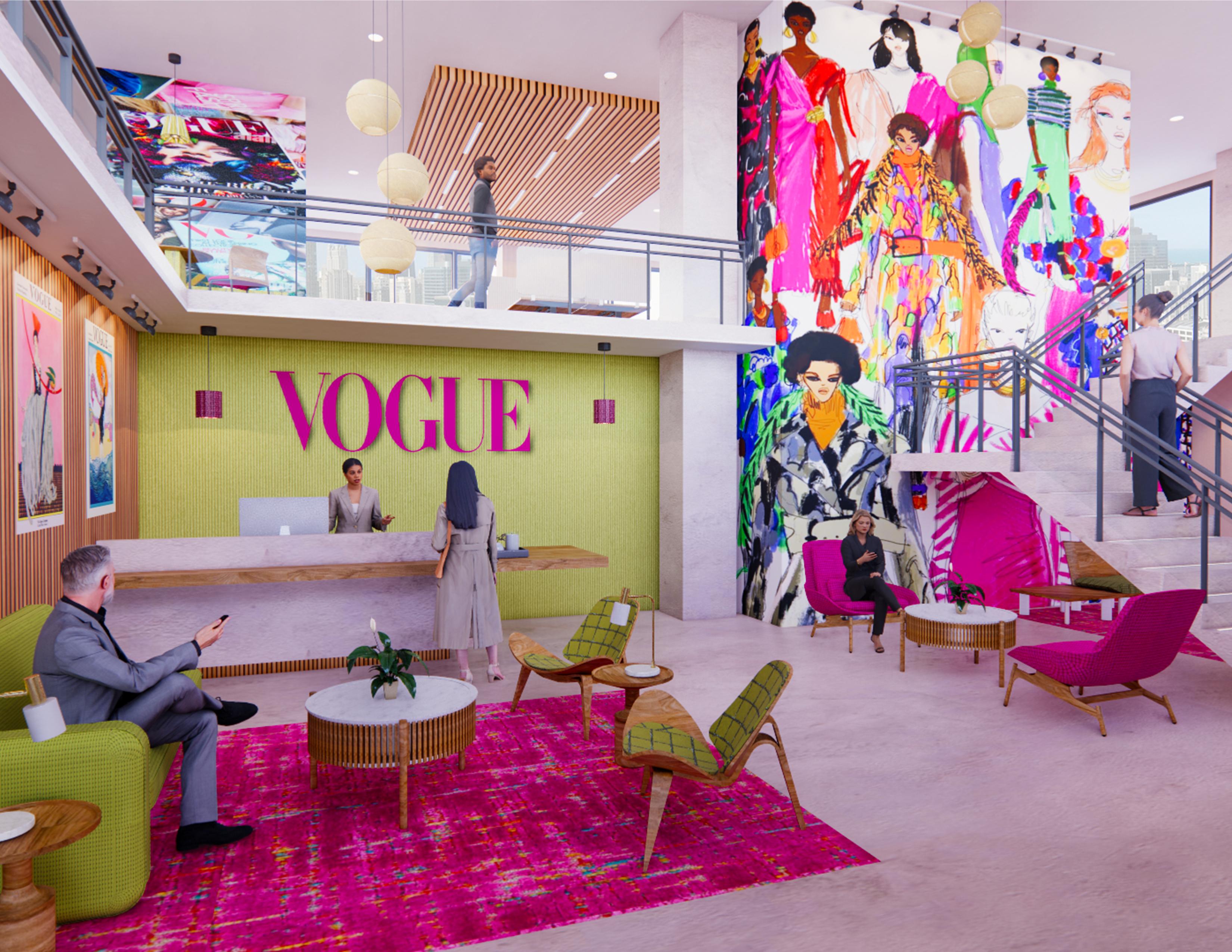Vogue is known for pushing the boundaries of style and fashion, while still remaining true to itself. These values can be summed up as authentically daring. This adventurous and daring spirit is reflected in and encouraged by a newly designed satellite office space in San Fransisco, California. Vivid colors and lively patterns create an environment that fosters creativity and collaboration. Similar to the fashion world, office spaces and needs are always changing, making flexibility a top priority. Vogue’s new hybrid office supports workers of many professions with a mix of collaborative and focus spaces that recognize the many types of work that go into creating Vogue magazine.