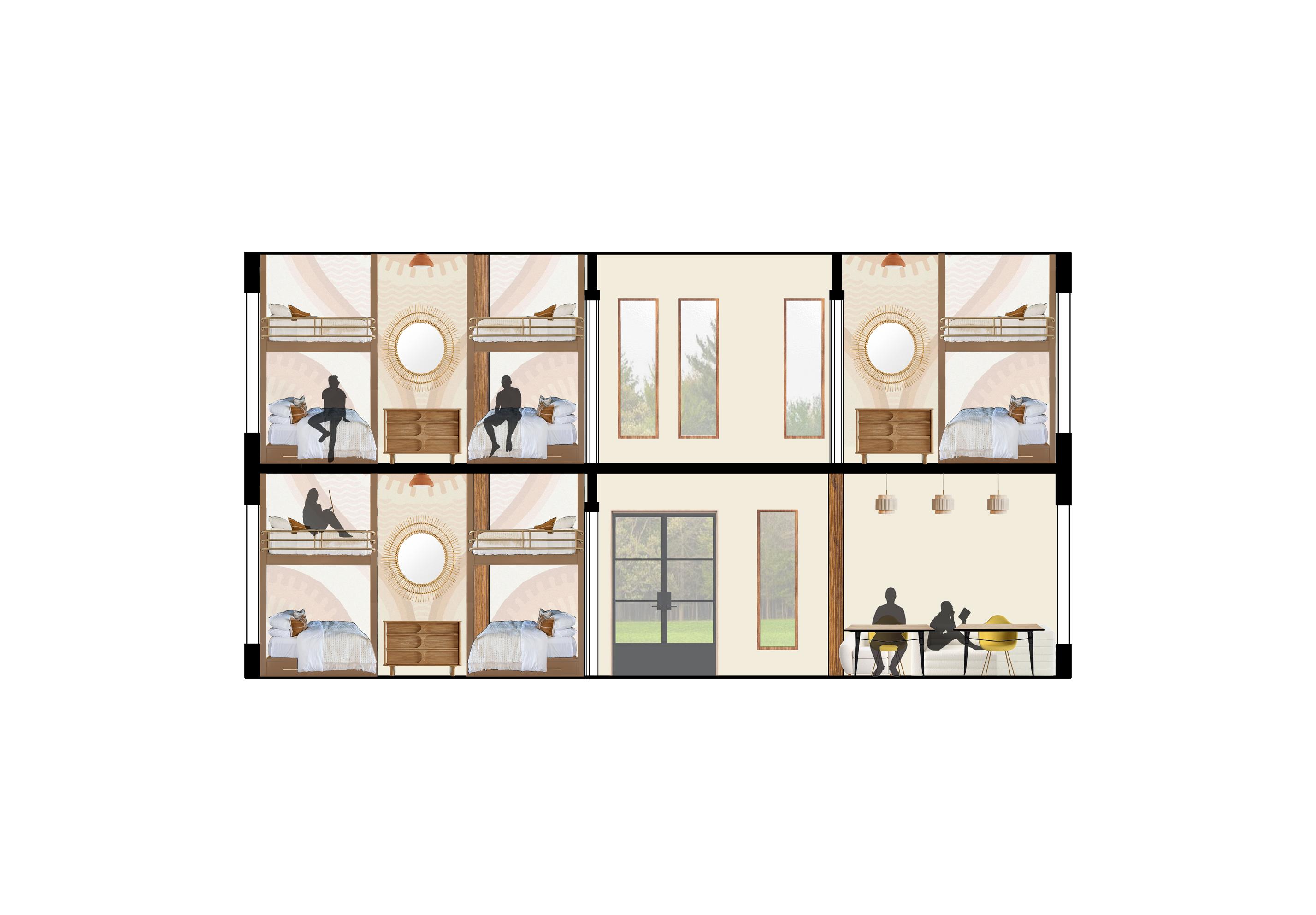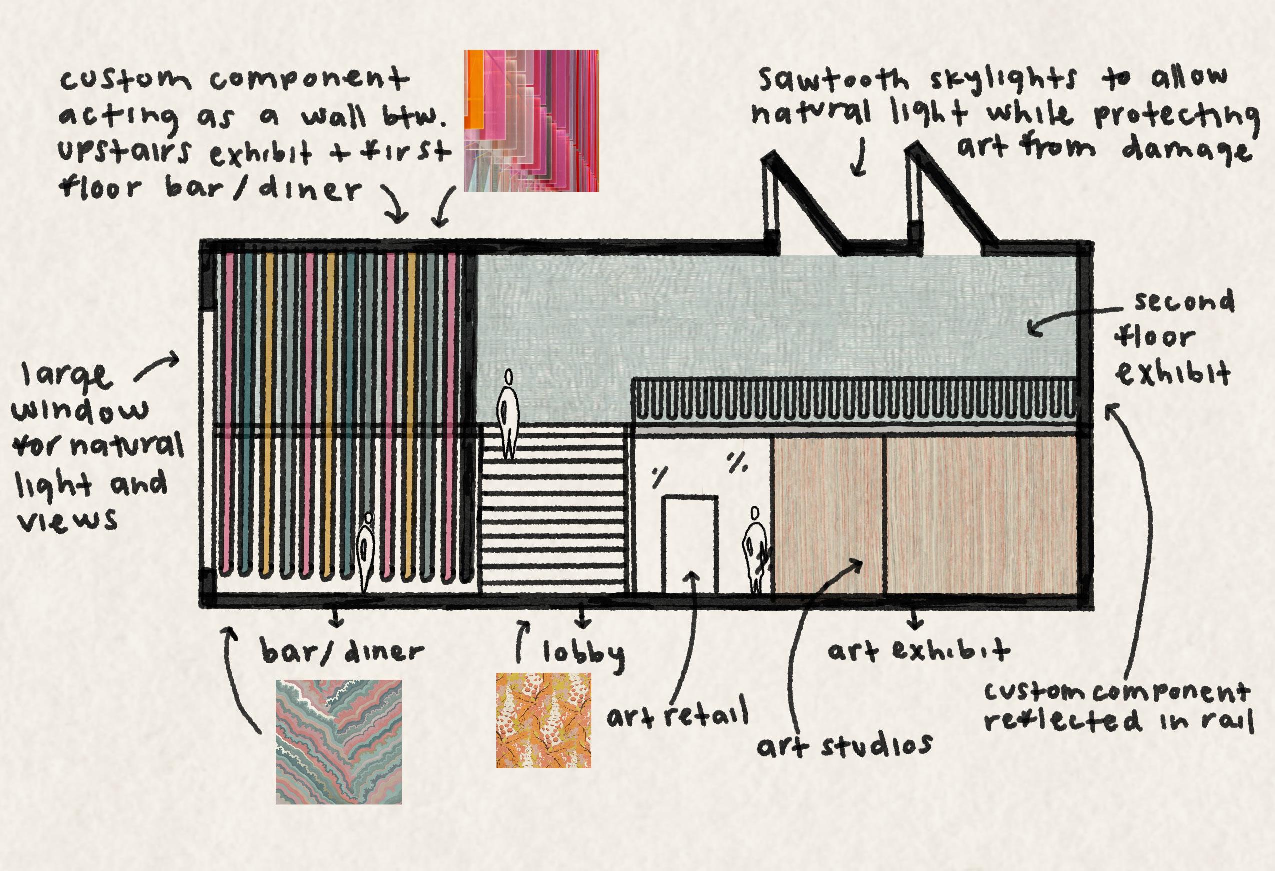 This boutique hotel, located in Asheville, North Carolina, features spaces for artist residencies, art exhibits, and community gatherings. Fusion allows for the blending between visitors, art, and artists to support the local community and creative exploration. This concept and the conceptual thinking was inspired directly by art forms and museums. By viewing the building as a museum and each space within it as art pieces that all come together to form a cohesive whole, the space was designed to be a lively and diverse space for the local art community.