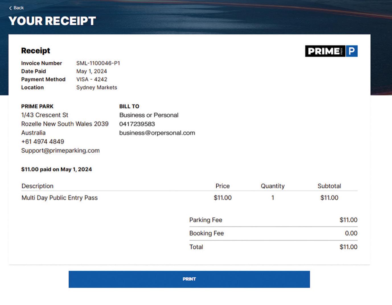 All payments and invoicing will be through Prime Park using the Stripe payment system. Payments can be made at the time of registration/purchase online using EFT,